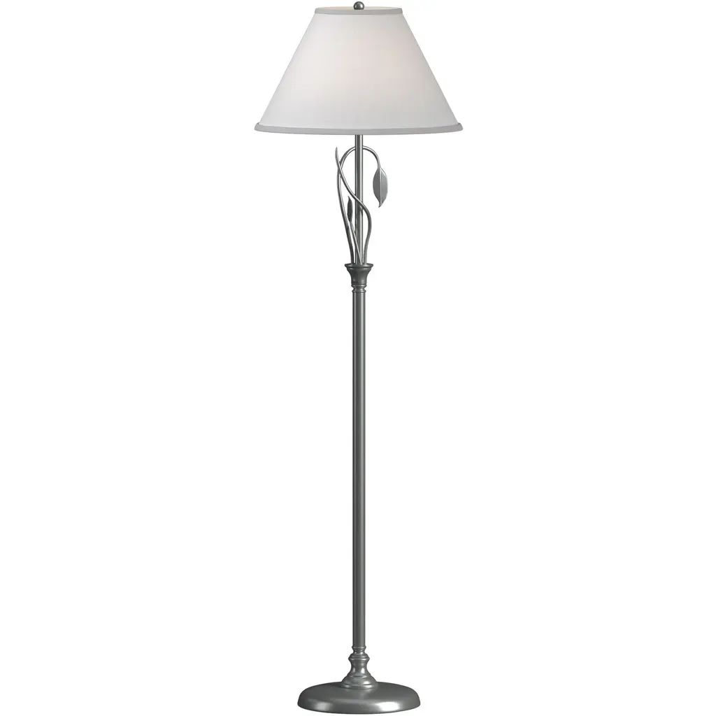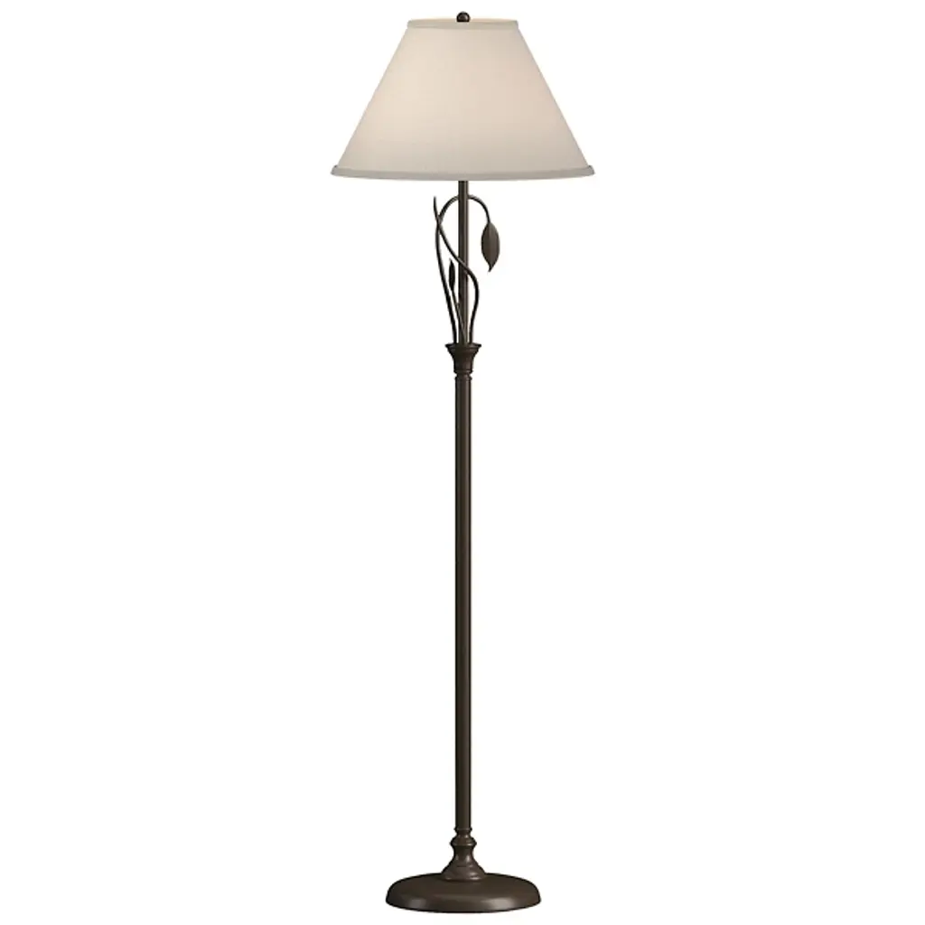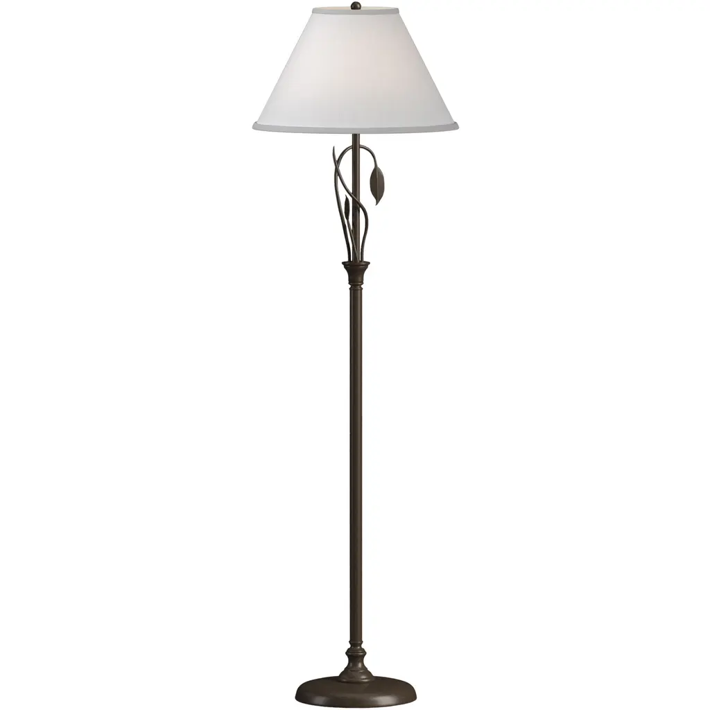Forged lighting with the delicate look of “sylvan steel.” The Forged Leaves and Vase Floor Lamp by Hubbardton Forge is the ideal piece to bring a touch of nature as well as plentiful ambient light to a living room or reading nook. It features a soft, flared fabric shade atop a tall, distinctively organic-looking base. The base is hand forged iron, with intricate stems and leaves that appear to sprout out of the main stem and curve around it.