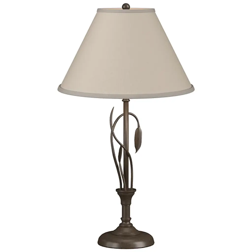 A table lamp inspired by the elegance of nature. The Forged Leaves and Vase Table Lamp by Hubbardton Forge is a prime example of “sylvan steel,” metal forged to create delicate-looking leaves and stems. The base is hand forged iron, with those leaves and stems appearing to actually grow out of the column. The fine details and curves are highlighted by the wash of light shining downward from the flared fabric shade.