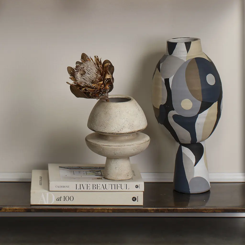 This bold vase offers an eye-catching accent to any tabletop. Handcrafted of ceramic in a matte textured finish, it features an abstract geometric silhouette. Display your favorite bundle of faux floral or showcase on its own like a collected, and much loved, decorative accessory.