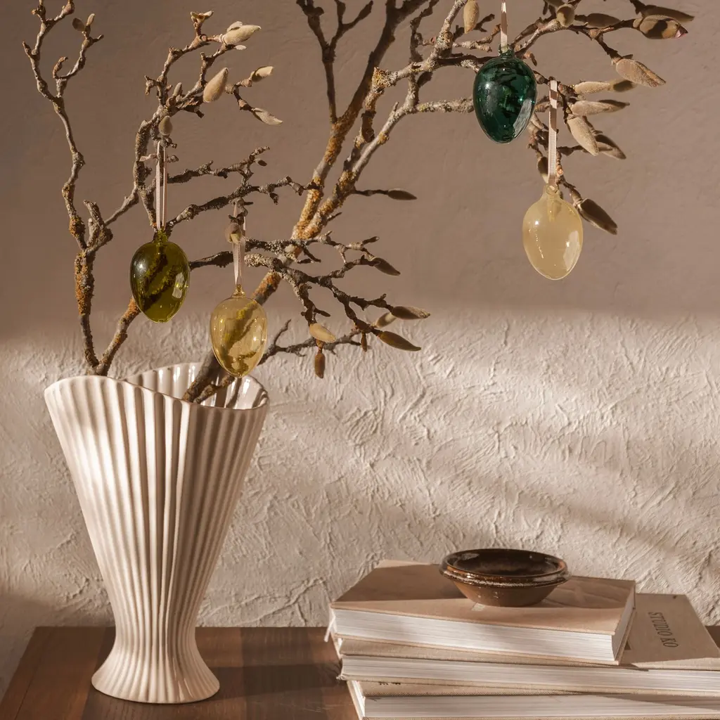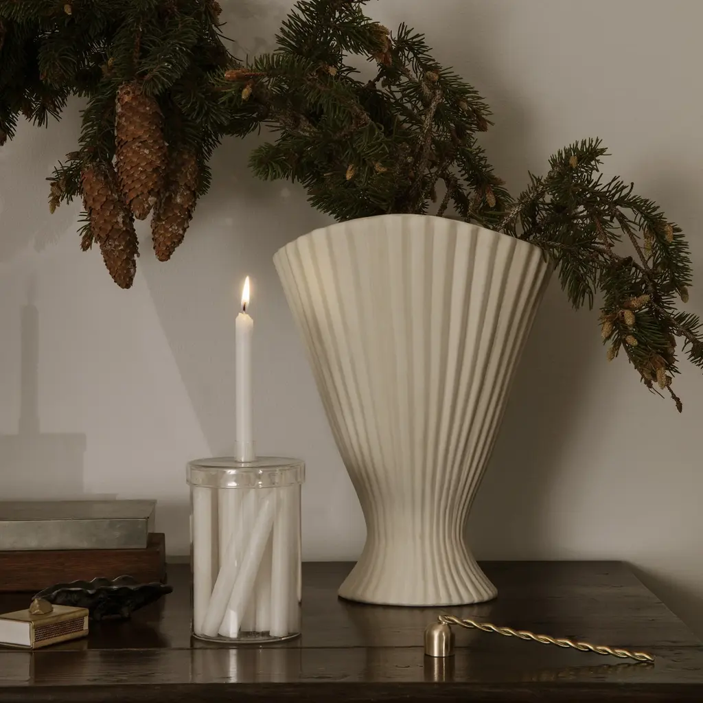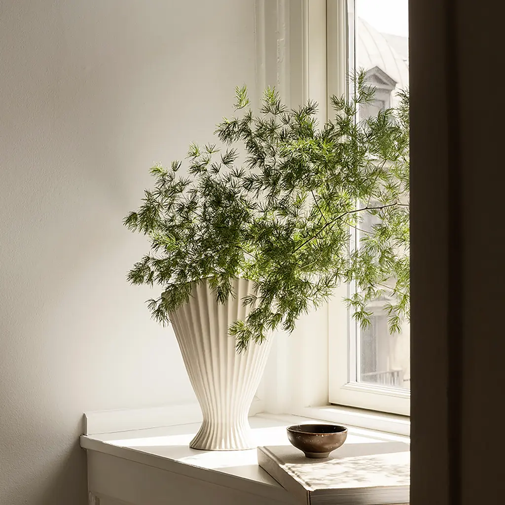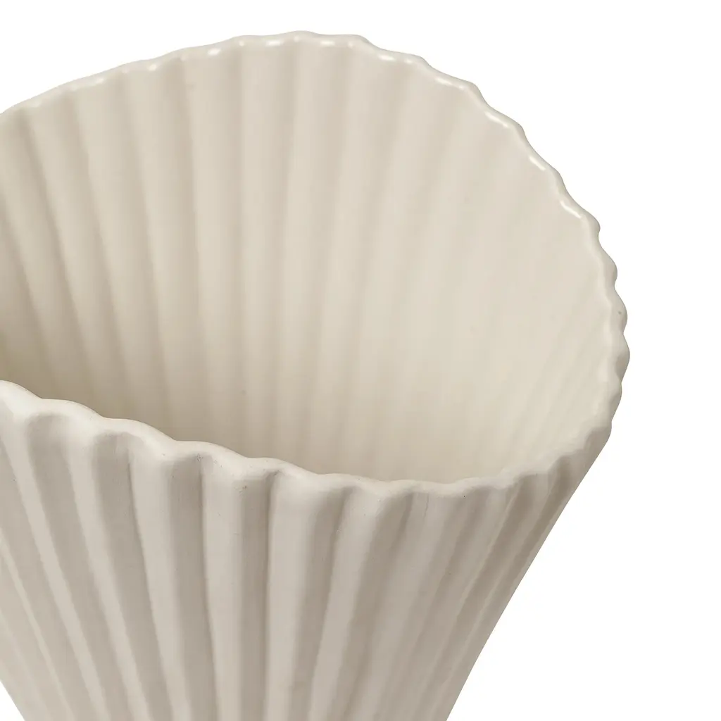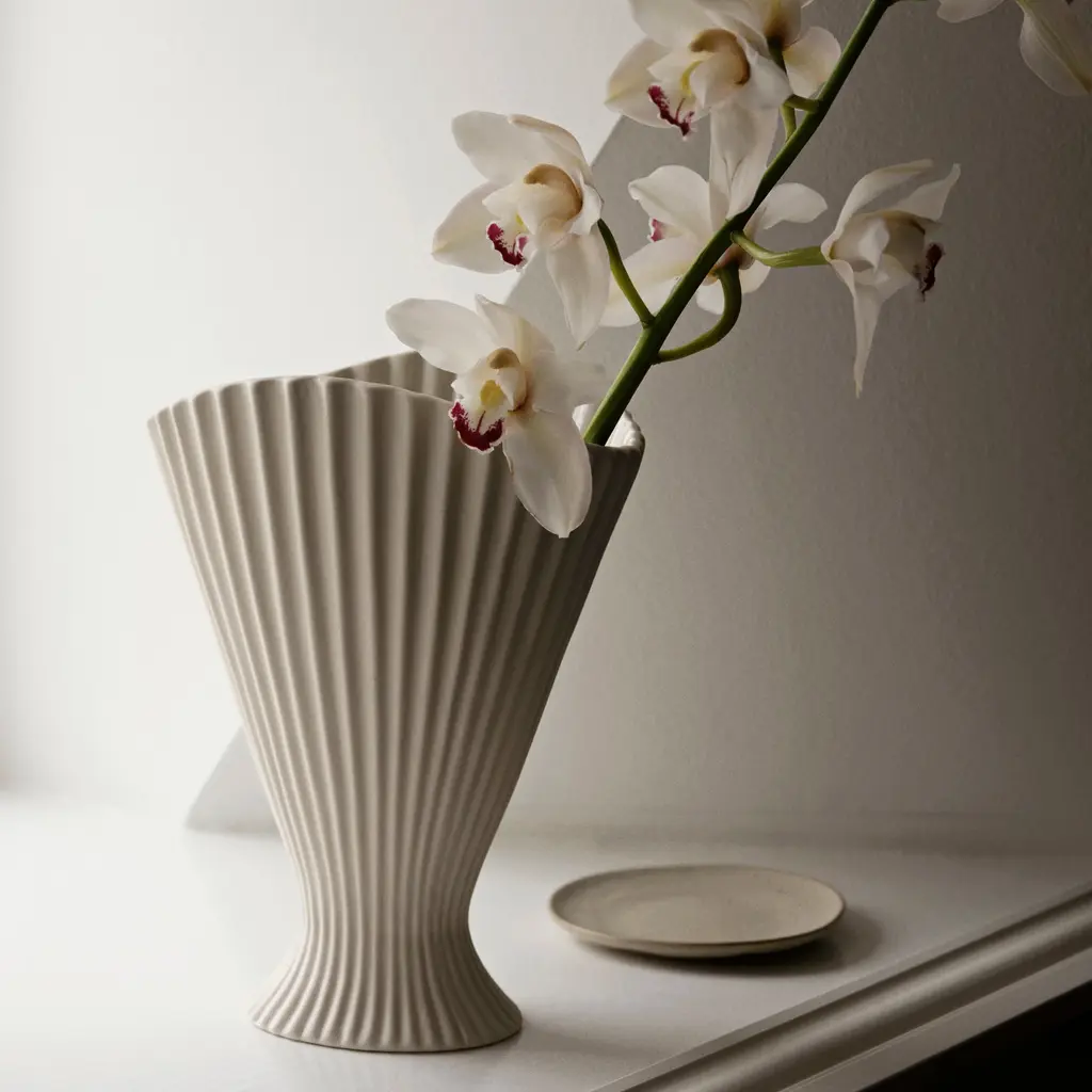 The Fountain Vase captivates with its sculptural form and soft, pleated design, reminiscent of classic fountains. Crafted from ceramic, it features a matte exterior and a glazed interior, making it ideal for displaying flowers or as a standalone decorative piece. Available in 2 sizes—small and large.
