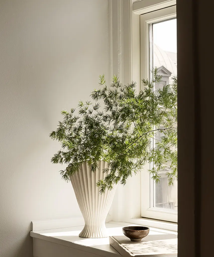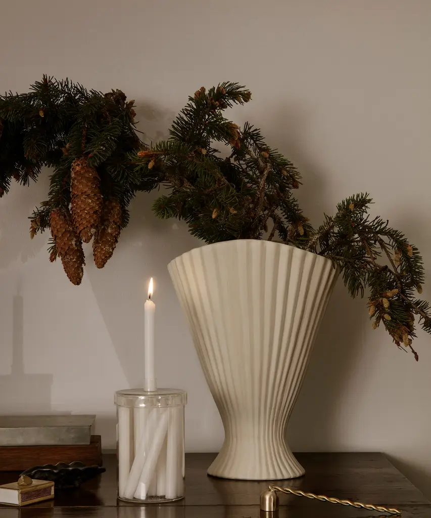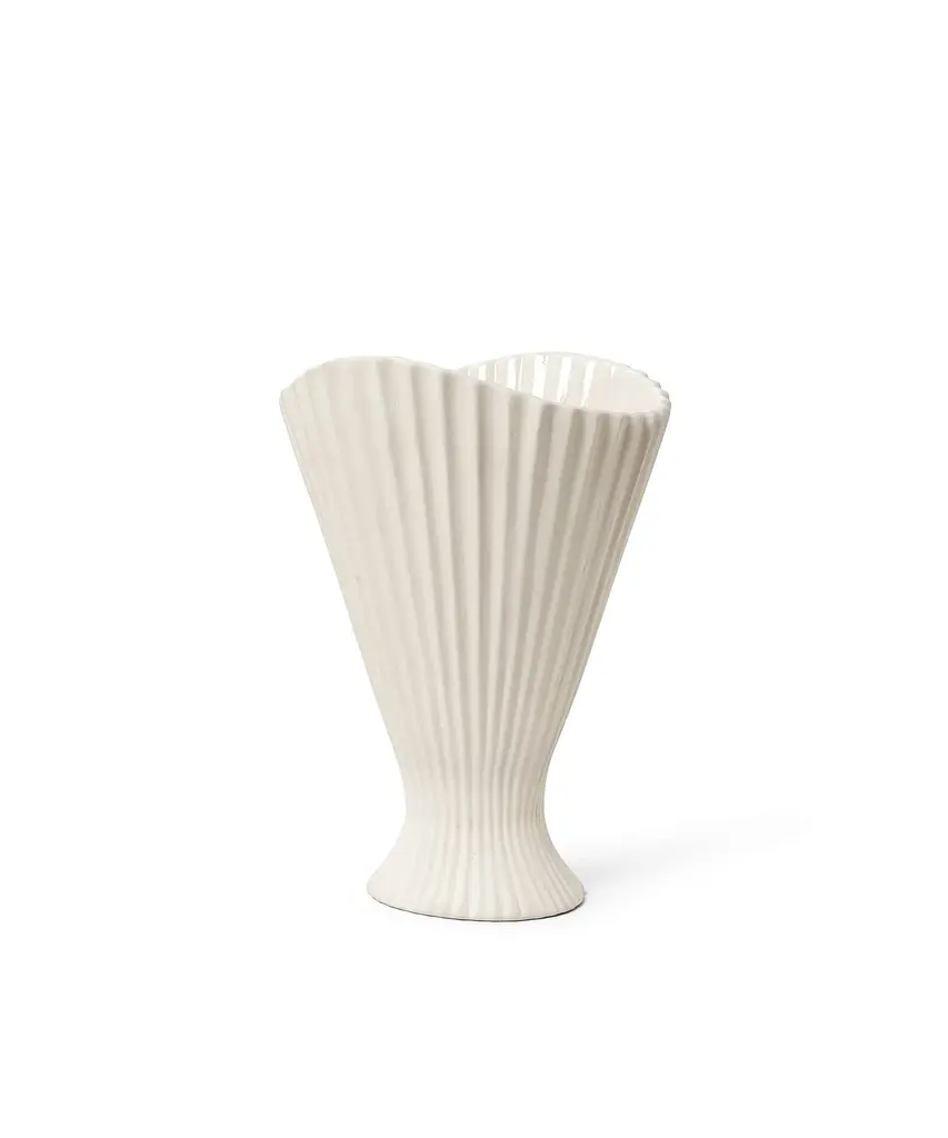 A more compact extension of our cherished Fountain Series, this vase immediately captivates attention with its elegant, sculptural shape and softly pleated design. Inspired by the form of a classic fountain, it can be filled with flowers and branches or stand alone as a stunning decorative piece. The Fountain Vase features a matte exterior and glazed interior, enhancing its sophisticated appeal and adding a touch of delicacy to your table setting. Designed and produced by the Copenhagen-based studio Ferm Living.