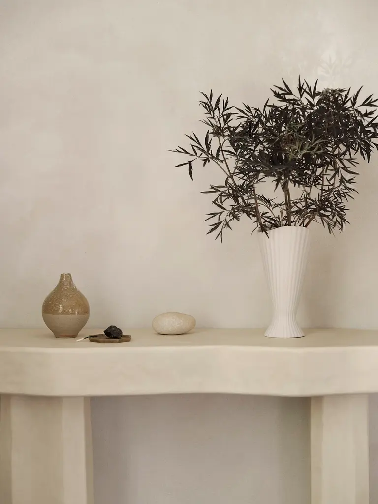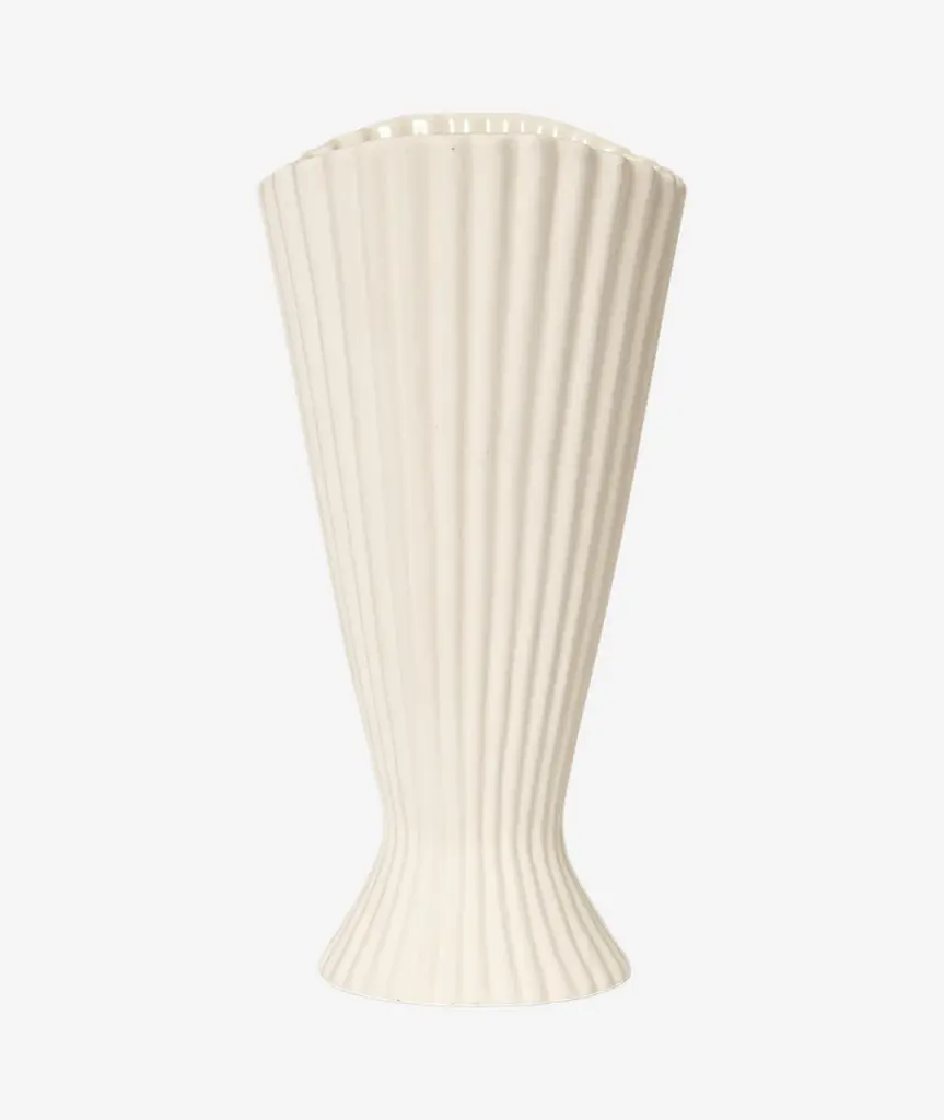 Instantly drawing your attention, the sculptural, ceramic Fountain Vase is an elegant piece with a soft, pleated expression. Inspired by the shape of classic fountains, it can be filled with flowers and branches or stand on its own as a decorative and delicate addition to your table setting. The Fountain Vase has a matte exterior while the inside is finished with a clear glaze.