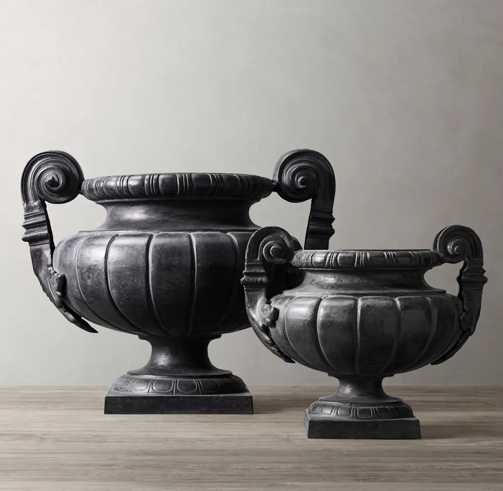 Characterized by dramatic scrolled handles, our pedestal urn pays tribute to Second Empire design – a mid-19th-century French style characterized by elegant lines and abundant ornamentation. Cast in metal, the form is etched for a rhythmic play of texture and finished with a rich, grey patina.