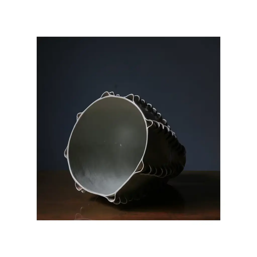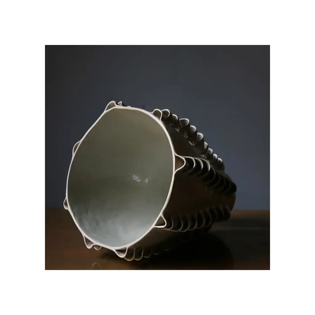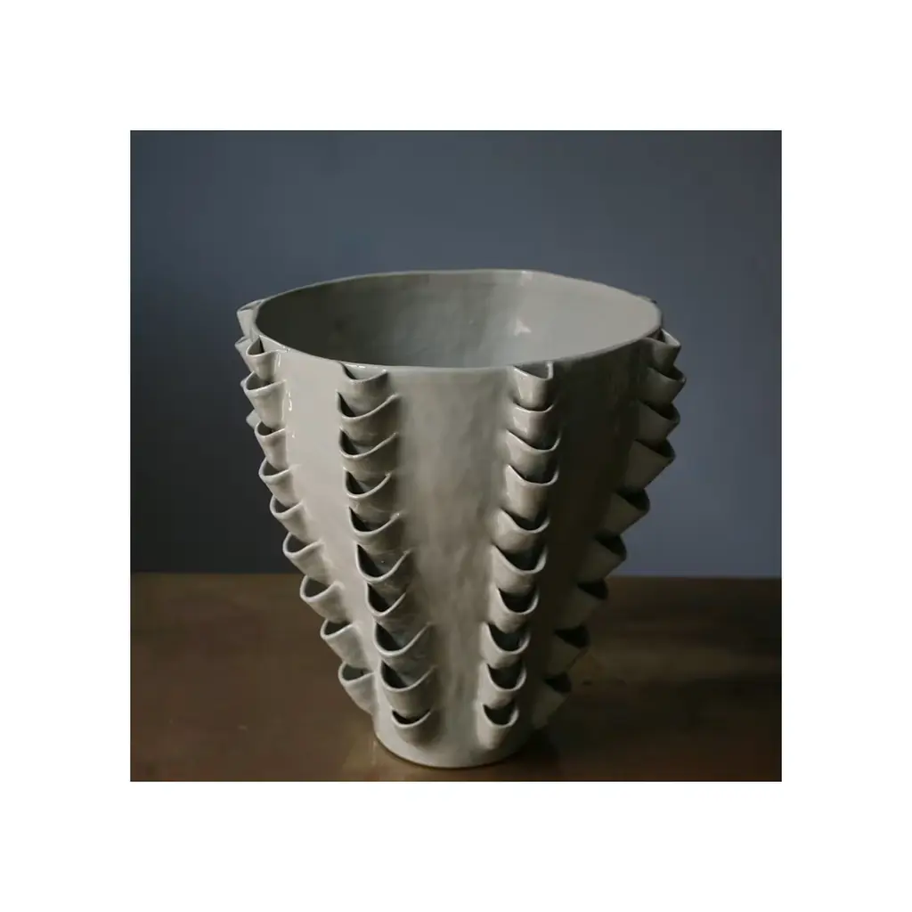 A piece of unique decor, this simple yet elegant terracotta vase is made by hand using the colombino method and finished with a lustrous glaze in soft sage. The vase is in the shape of a truncated cone and decorated with curved pockets in relief running vertically down the sides and creating a striking contrast. The result is an intriguing design that appears completely different when viewed from the sides or from above.