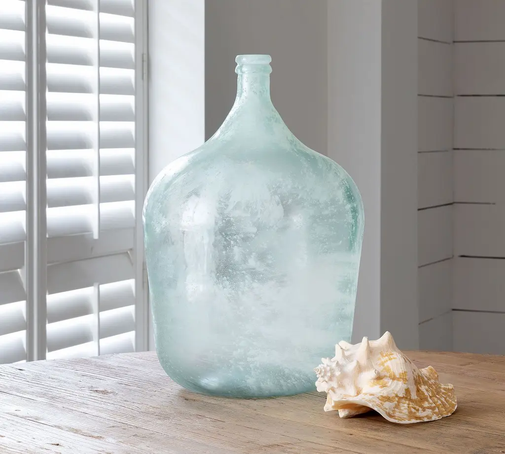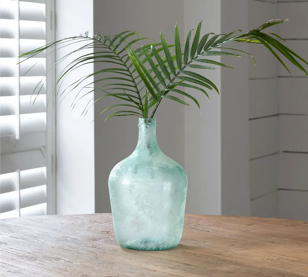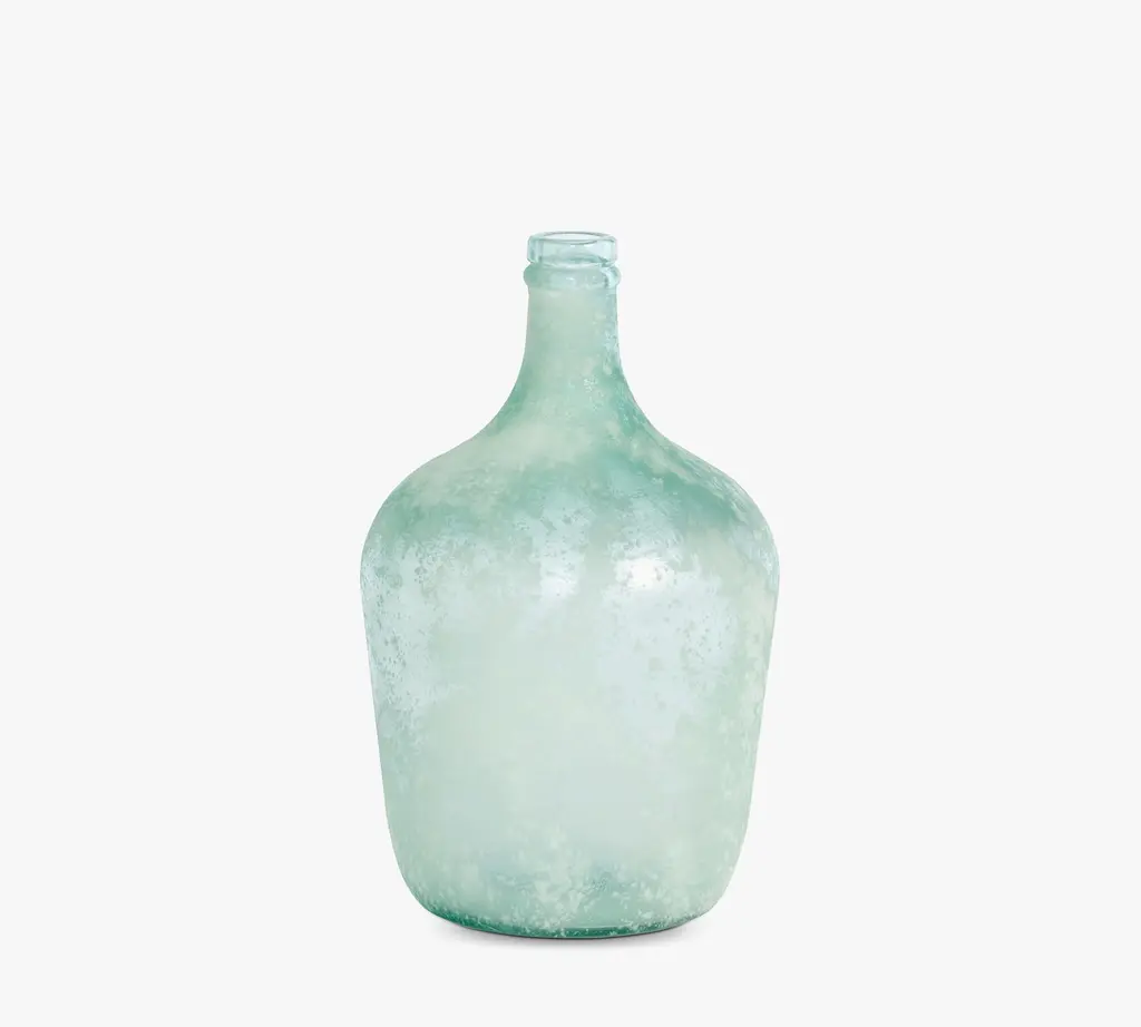 Handcrafted recycled glass adds a sun-drenched patina and frosted seafoam quality to this cellar bottle. We love it on its own as a statement piece filled with breezy palm fronds or tall sea grass, or grouped with other artisanal wares to create a well-styled, rustic vignette.