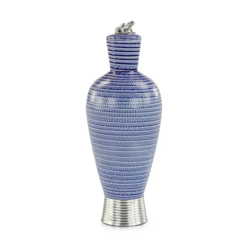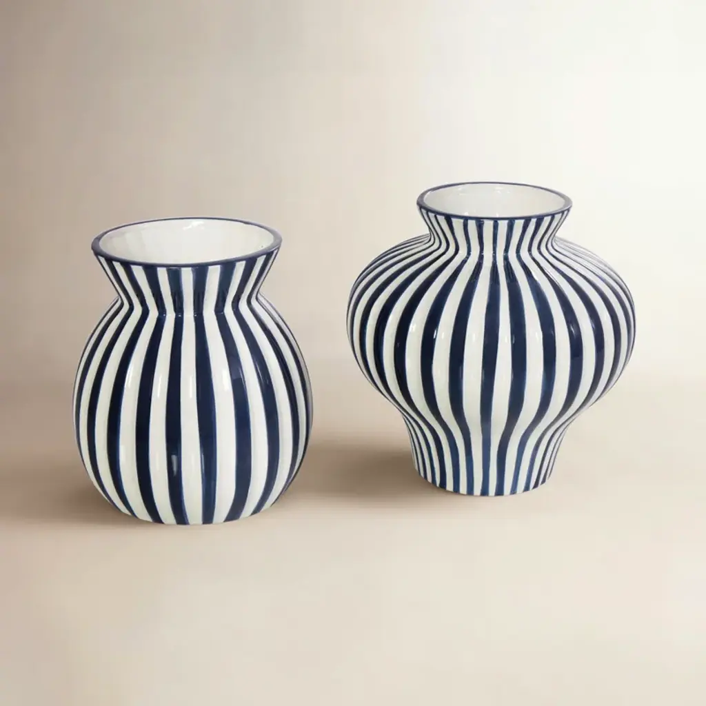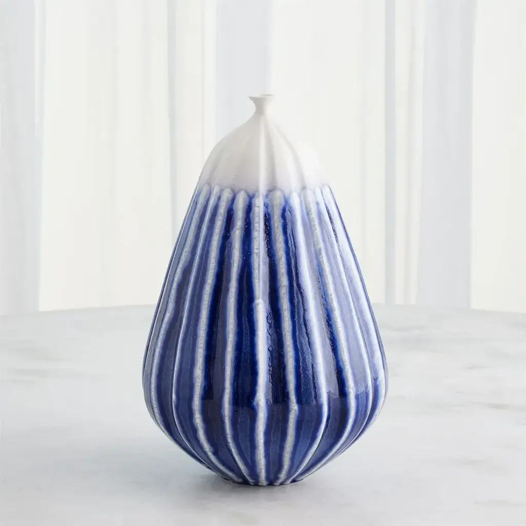 The Furrow Taper Vases are exquisitely handcrafted from Portuguese slip-molded ceramic, featuring a striking cobalt reactive glaze, and adorned with hand-applied white stripe details. From a fashion forward perspective, Global Views offers accessories, furniture, statement lighting, and an assortment of rugs and mirrors to add beauty and joy to your home.