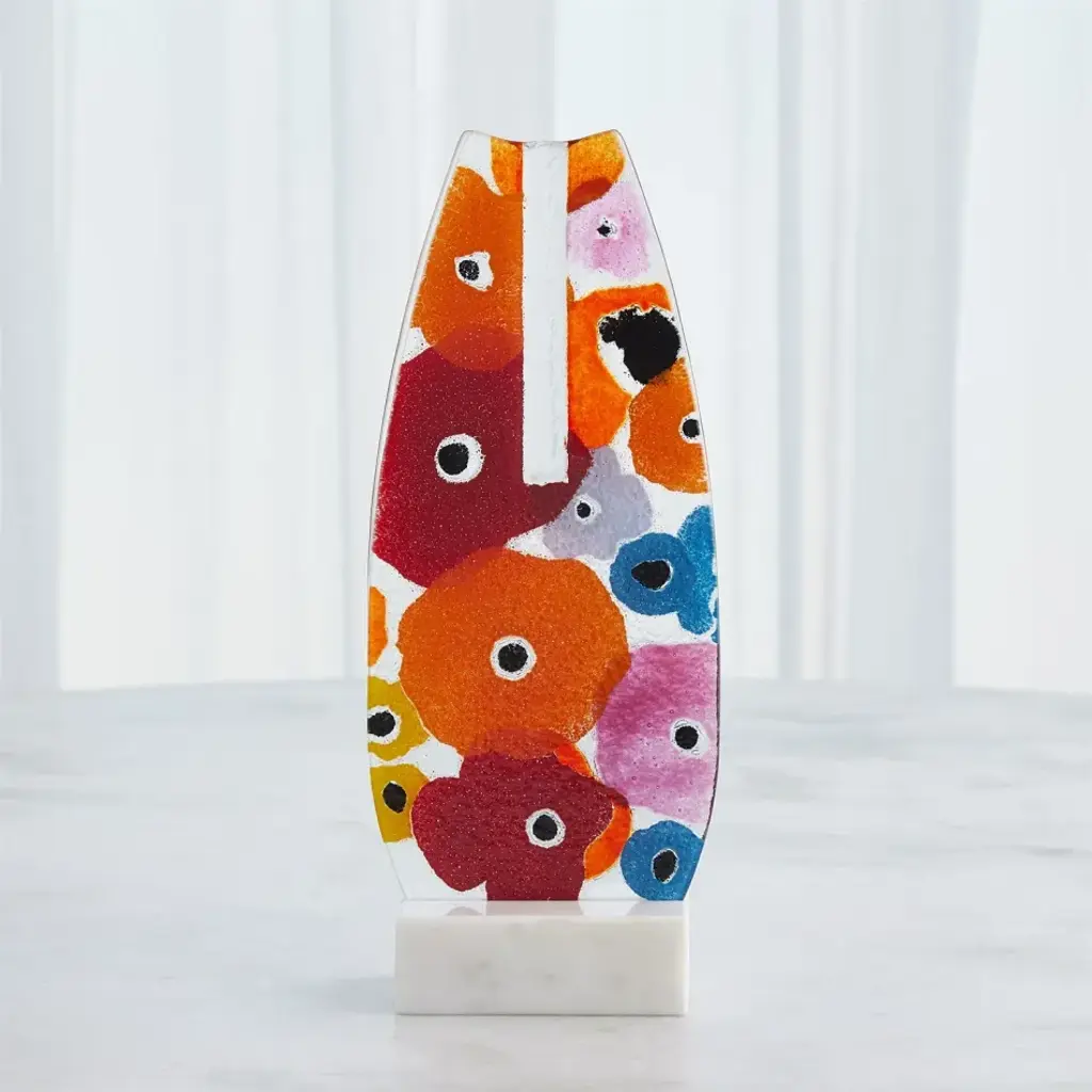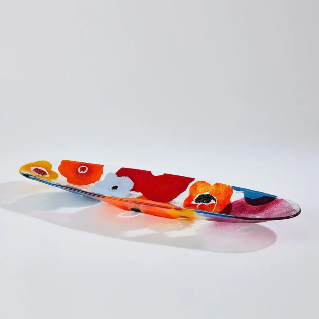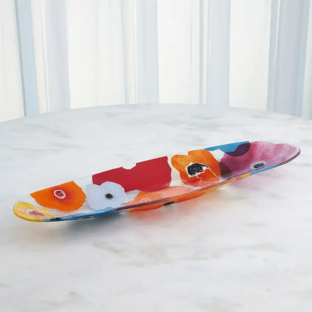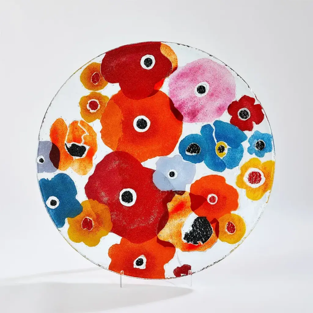 The Fused Floral Collection by Portuguese artisans begins with clear glass cut into desired shapes. Using templates, artisans layer colored sand onto the glass, creating intricate floral designs. After layering, a second clear glass piece is added to form a sandwich. The assembly is then carefully kiln-fired at high temperatures, fusing the layers and producing exquisite floral art. From a fashion forward perspective, Global Views offers accessories, furniture, statement lighting, and an assortment of rugs and mirrors to add beauty and joy to your home.