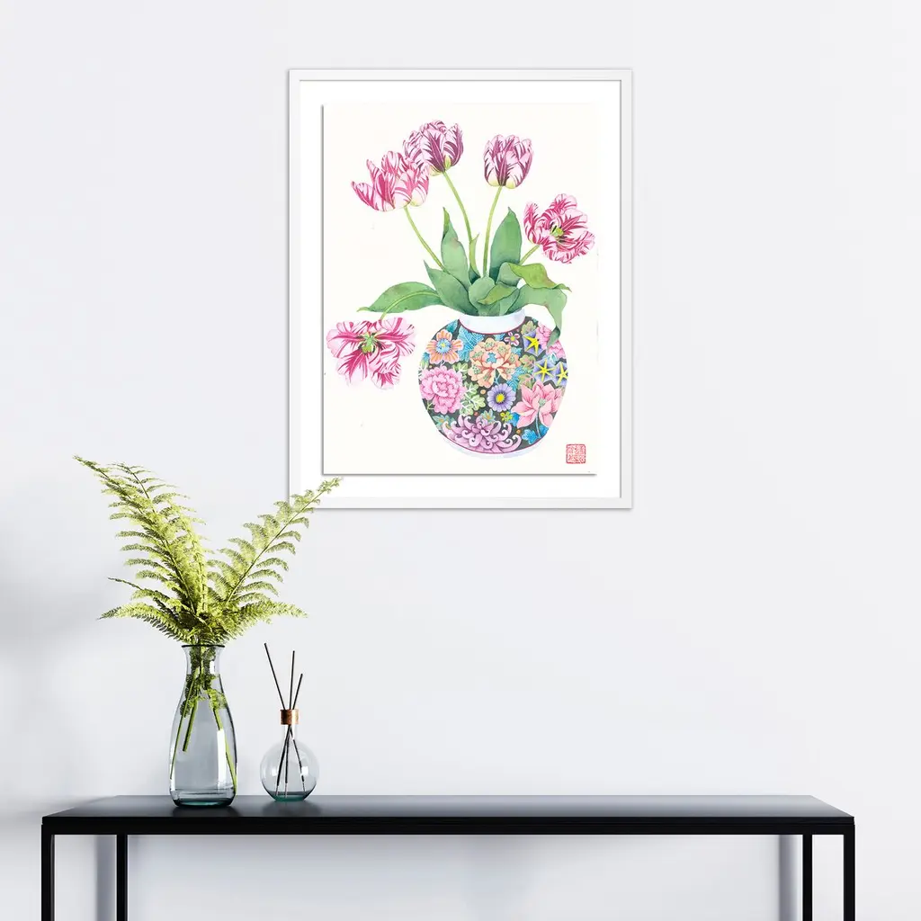This work from Gabby Malpas brings any wall to life with its vibrant florals and detailed porcelain vessels. Printed on high-quality paper with deckled edges, floated over a mat, and displayed in a simple wood frame, this piece arrives ready to hang. Gabby Malpas creates joyful, intricate watercolor works. Locally grown flowers and fruits picked nearby are rendered with tender warmth, often borrowing from the delicate aesthetics of Chinese ceramics and Southeast Asian batik fabrics. She works on high-quality art paper which she sometimes stitches together to add texture. Gabby trained as a ceramicist in New Zealand and has lived for many years in the UK. She now resides in Sydney, Australia.