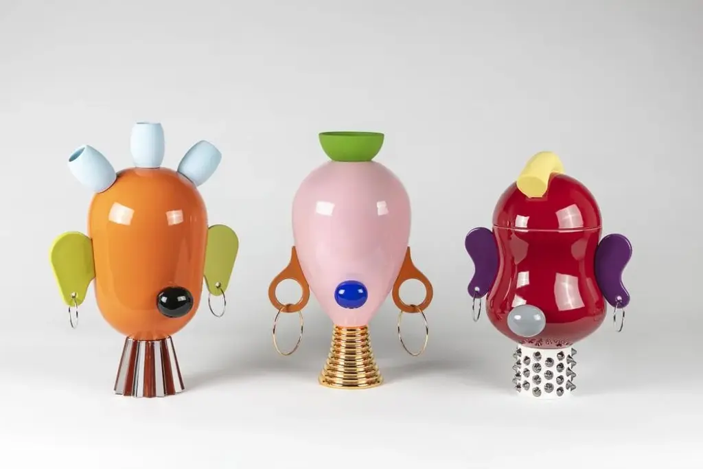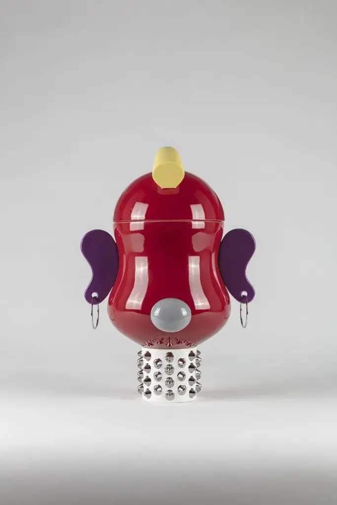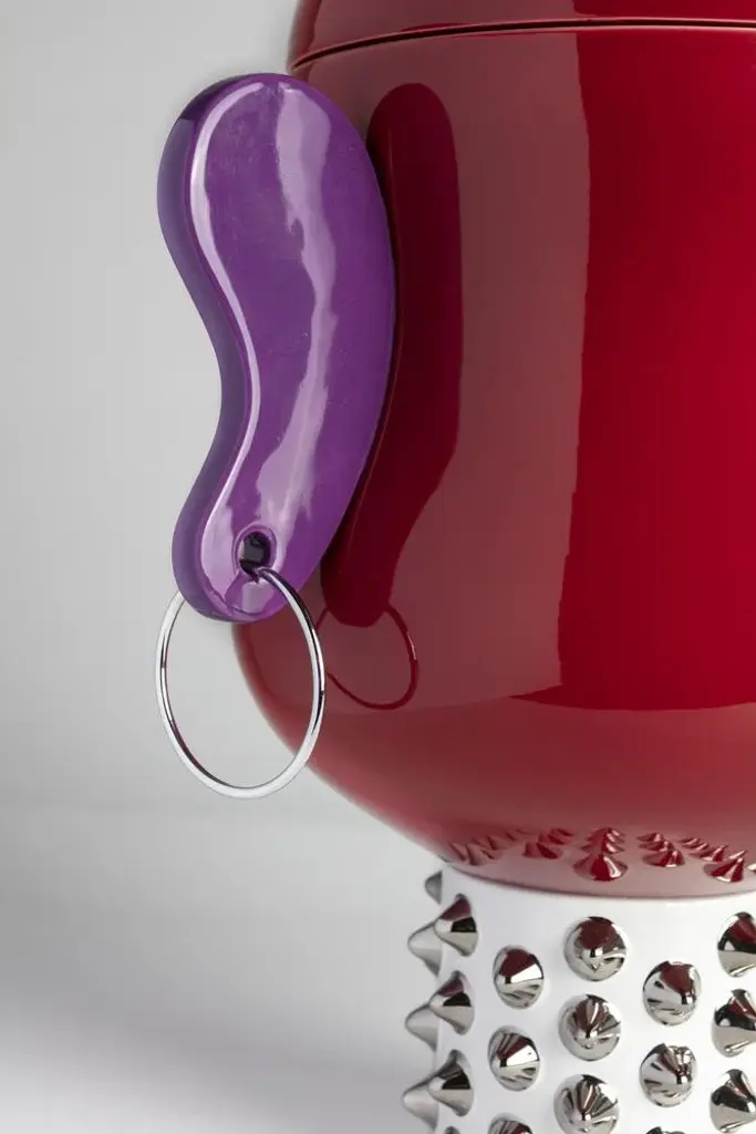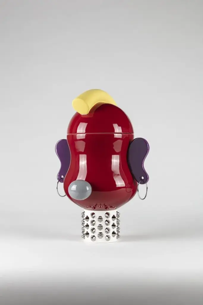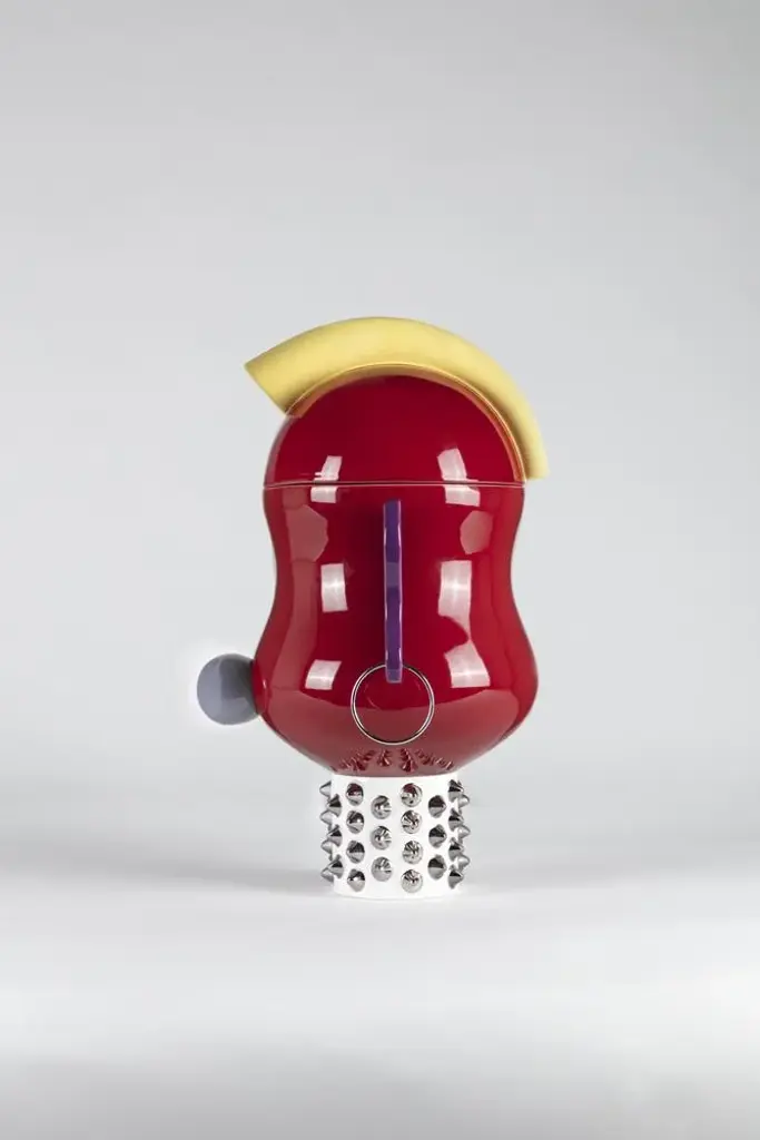 A large ceramic container inspired by the unmistakable aesthetics of tribal cultures. The charm for primitive language is expressed in a glamorous way through the mix of strong colors and simple geometric volumes; Each character represents an archetypal human presence, as a mask that acts on the domestic scene. The object is made and painted by hand by excellent Italian manufactures, its finish is a combination of shiny and opaque elements enriched by platinum details. Labeled by Maker