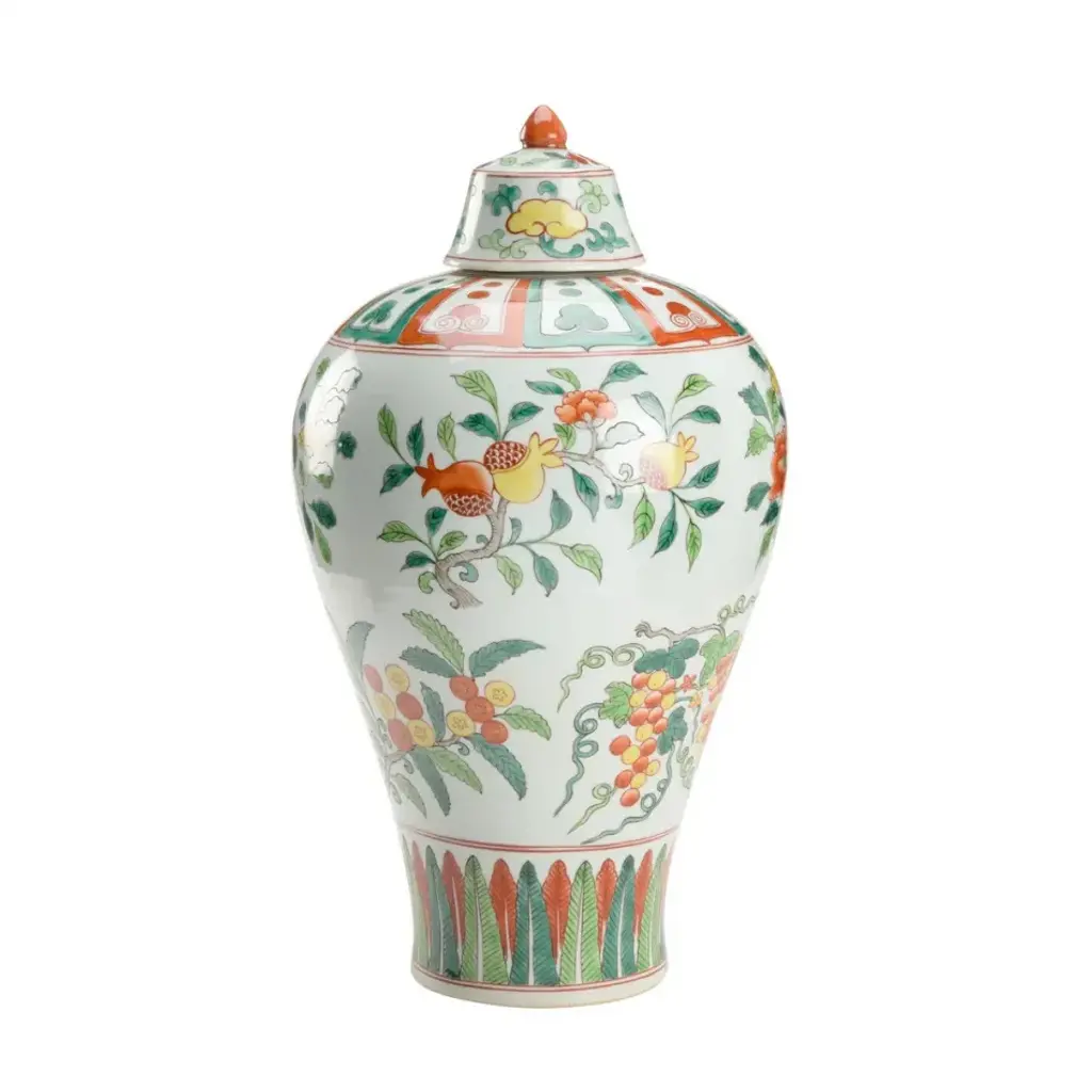 HAND PAINTED CERAMIC COVERED URN IN MULTICOLOR DESIGN. REMOVEABLE LID.