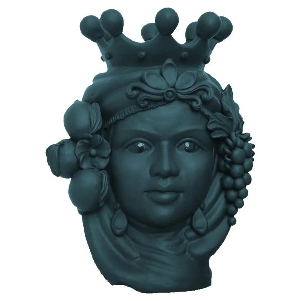 This anthropomorphic vase is made entirely by hand and painted in a dark blue opaque monochrome tint rich in natural pigments and resin binders that provide intense color depth. Only the eyes are glazed so they stand out, emphasizing the beauty of the gaze. The piece is inspired by ancient Sicilian legends of love and revenge between a Moor and a Maiden.