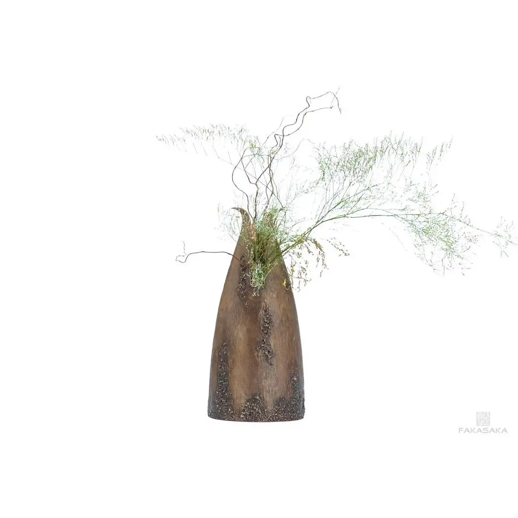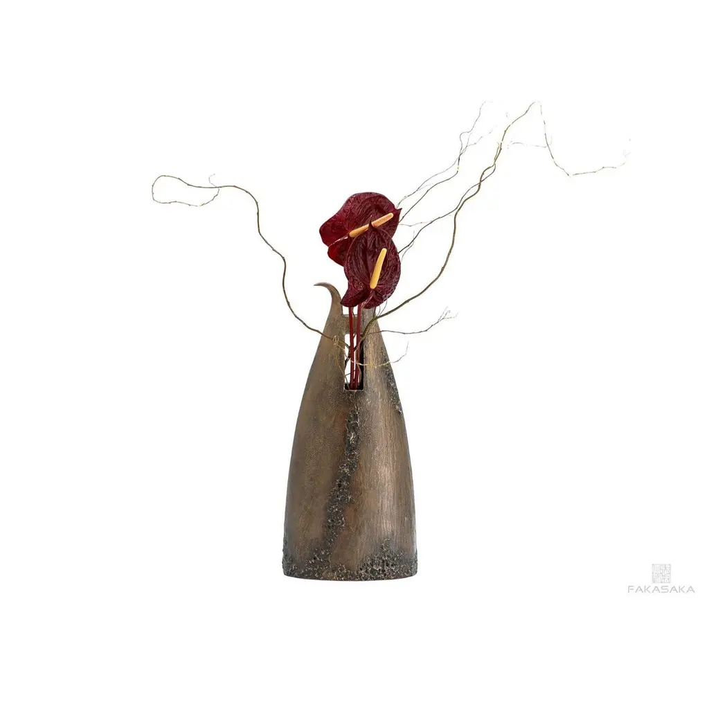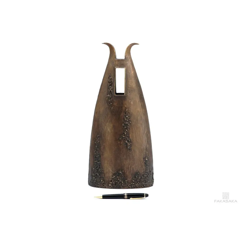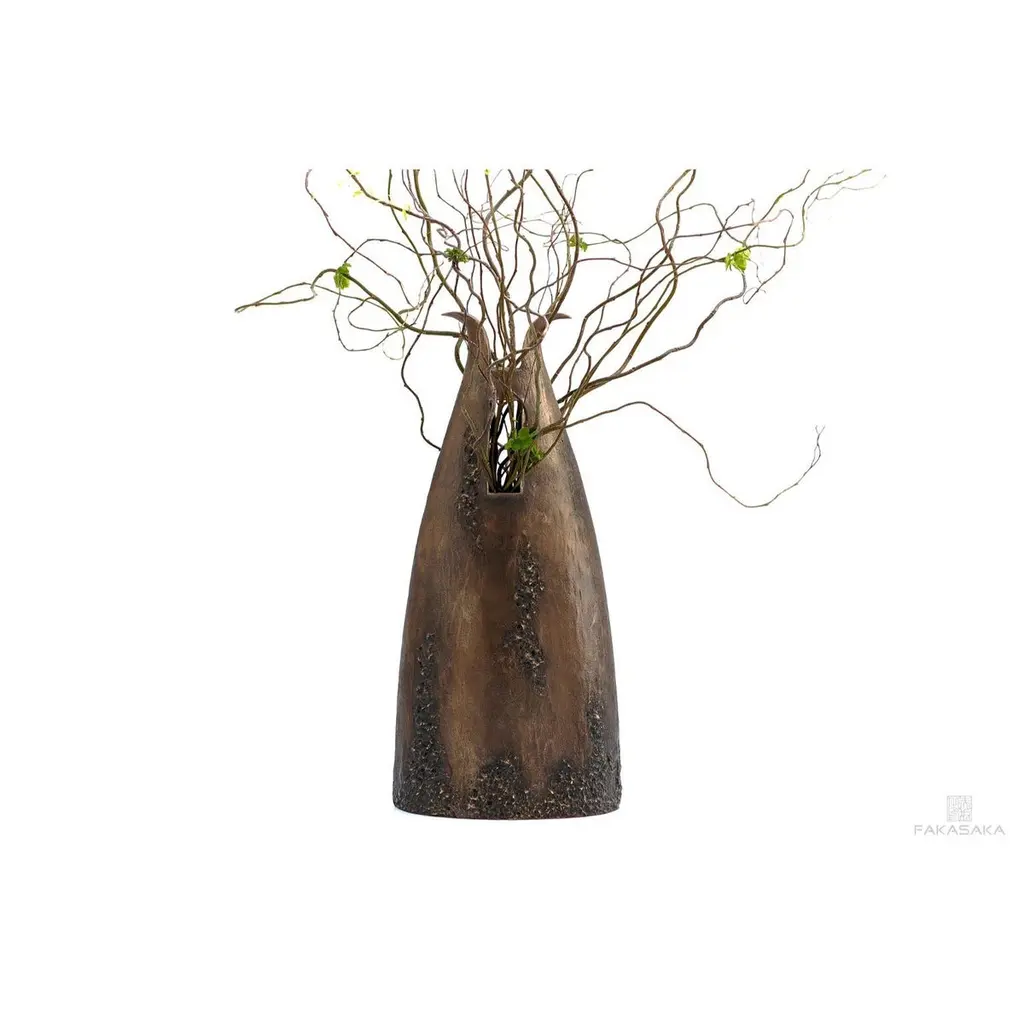 Garrym vase by Fakasaka DesignDimensions: W 19 cm D 12 cm H 41.5 cm.Materials: Dark Bronze. Fakasaka is a design company focused on production of high-end furniture, lighting, decorative objects, jewels, and accessories. Established in 2007, Fakasaka is the eponymous design company by Brazilian artist Fernando Akasaka distinguished by a penchant for producing intricate detailed cast bronze collectible design objects, furniture and jewelries. Fakasaka explores the contrast between the manmade and the natural through shapes and finishes that create a clear aesthetic. The constant challenge to balance elements is met with an outcome that is a striking assortment of bronze furniture and objects in oxidised and polished finishes, accented with precious regional stones, granites and rich prehistoric reptilian motifs.