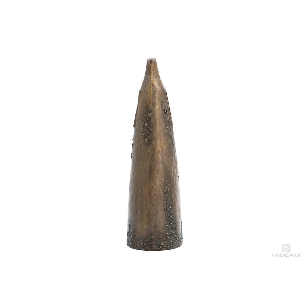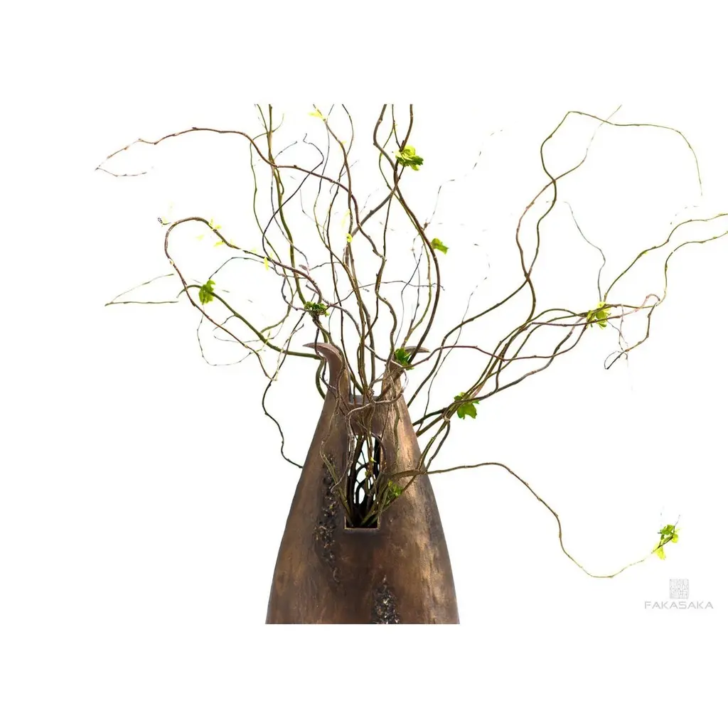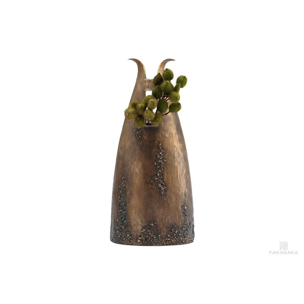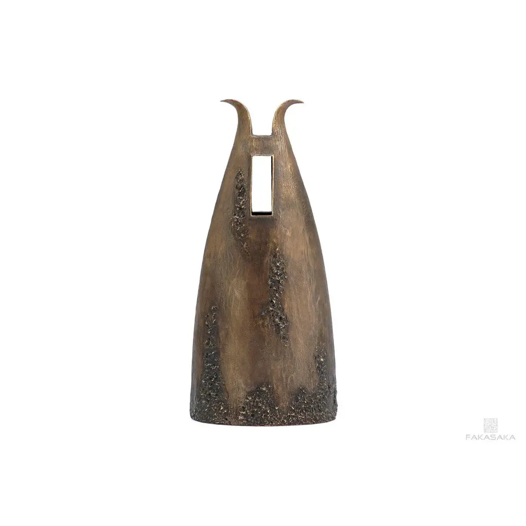 Garrym vase by Fakasaka DesignDimensions: W 19 cm D 12 cm H 41.5 cm.Materials: Dark Bronze. Fakasaka is a design company focused on production of high-end furniture, lighting, decorative objects, jewels, and accessories. Established in 2007, Fakasaka is the eponymous design company by Brazilian artist Fernando Akasaka distinguished by a penchant for producing intricate detailed cast bronze collectible design objects, furniture and jewelries. Fakasaka explores the contrast between the manmade and the natural through shapes and finishes that create a clear aesthetic. The constant challenge to balance elements is met with an outcome that is a striking assortment of bronze furniture and objects in oxidised and polished finishes, accented with precious regional stones, granites and rich prehistoric reptilian motifs.