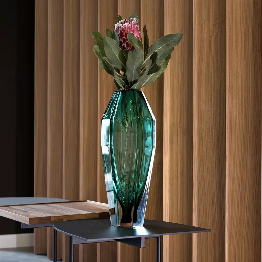 Purho continues to search for products with complementary shapes with the pair of Gemello and Gemella vases designed by Alessandro Mendini. Sharing the same design concept, the vases play on contrasting volumes, so that the first appears more slender whilst the second has softer lines, a nod towards the male and female silhouettes. Made of Murano glass, clear or with matt finish, the vases can be customized by choosing among the twenty-one shades of the colour chart. Available in 21 colors.