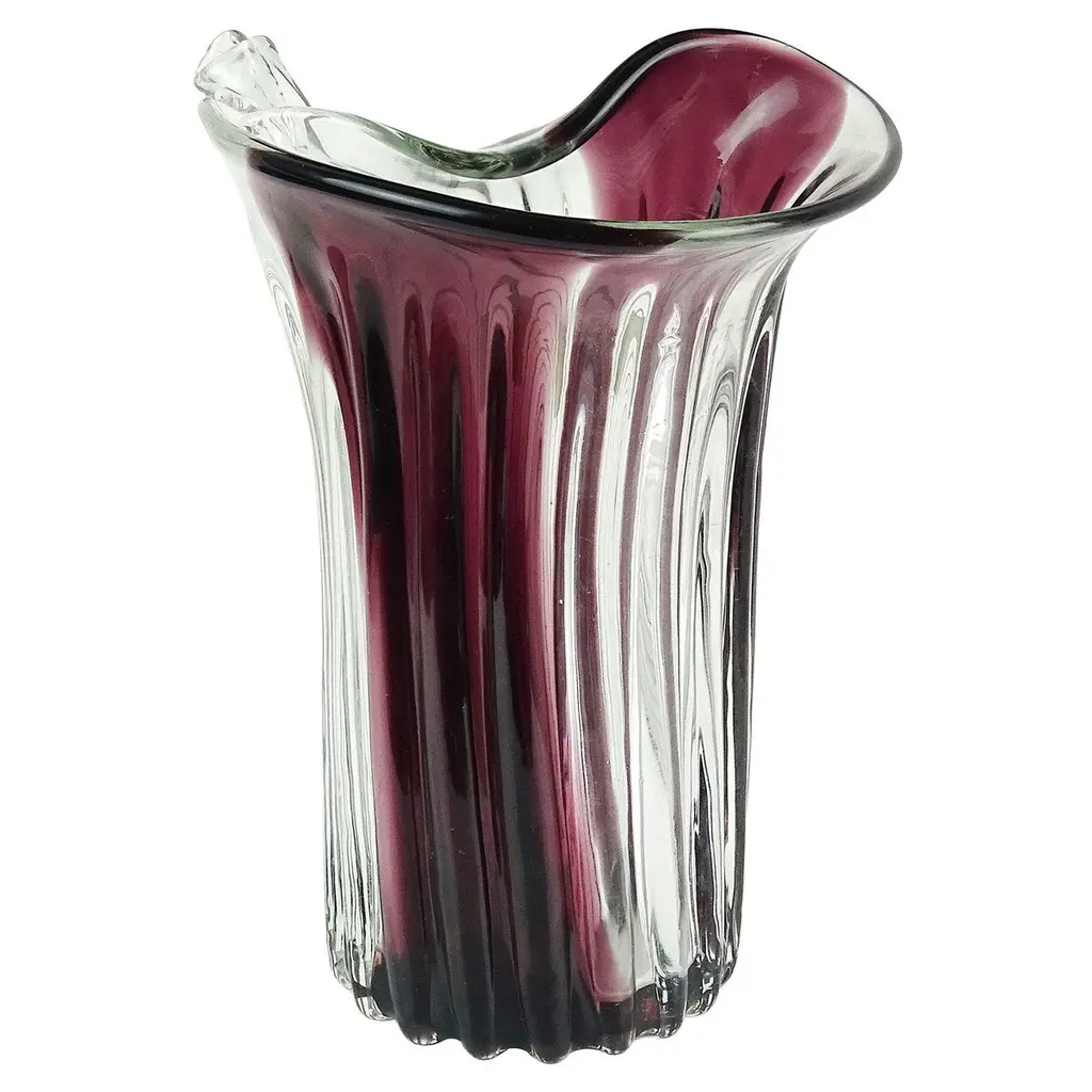 Masterfully handcrafted by expert artisans, this stunning vase is fashioned of mouth-blown Murano glass. The result of traditional mouth-blowing techniques such as "balloton" and "rigadin", the capacious and sinuous silhouette of this vase features an exquisite textural motif enhancing its shaded purple hue, which is also available in other colors. Please refer to the Concierge for details.