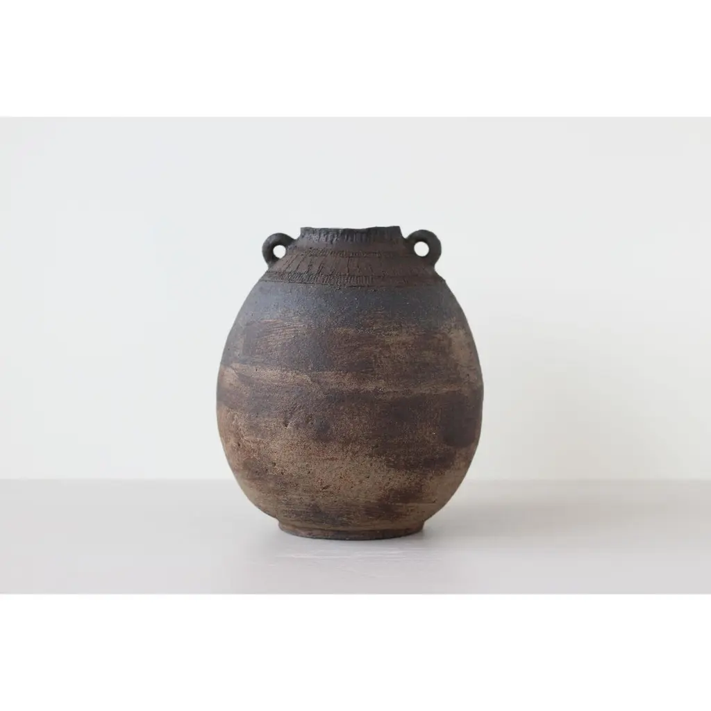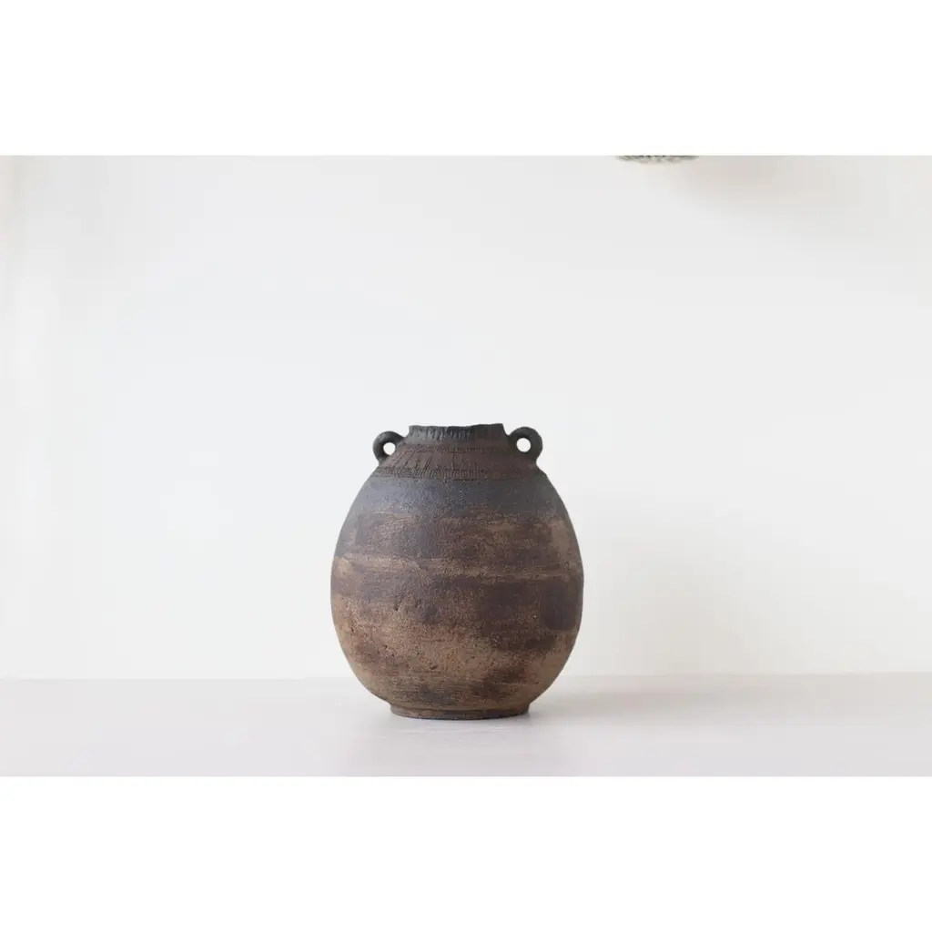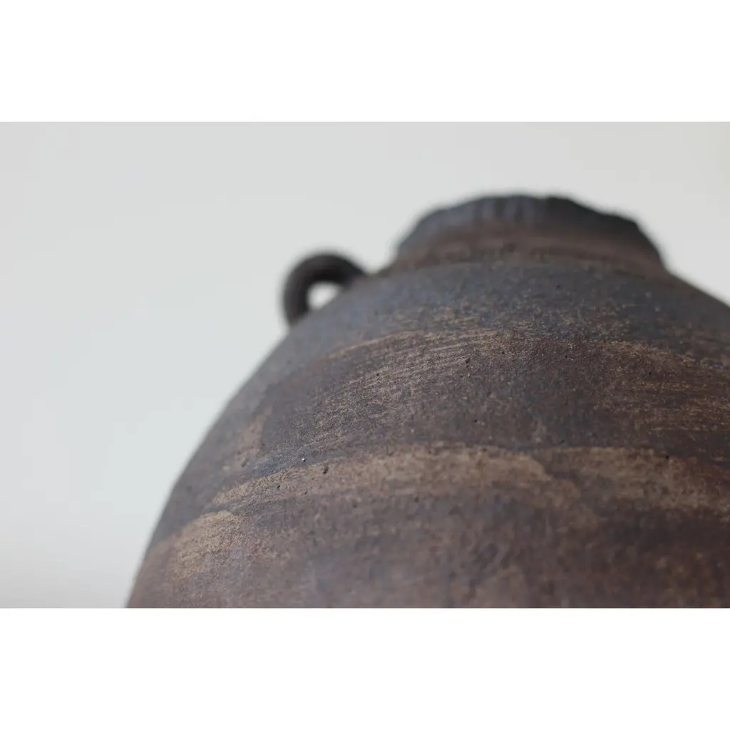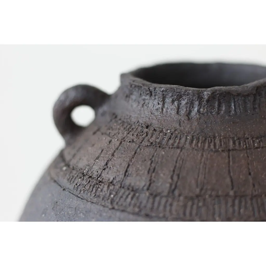 Generation 12 vase by Eguzkiñe EgañaUnique PieceDimensions: D 20.5 x W 20.5 x H 24 cm.Materials: black stoneware and slip In this series of pieces, called 13 generations, Eguzkiñe connects with an imaginary world from his previous thirteen generations, where he speculates on those past lives, imagining them as lives dedicated to the artisanal creation of everyday objects.With the clear intention of recovering our roots and especially thevalue of craftsmanship, the artist enters it understanding it as a slow and thoughtful process, in which a job well done and conscientiously prevails.Unique piece.Eguzkiñe Egaña Corta studied advertising and for more than 20 years has worked as a graphic designer. About 12 years ago, surrounded by a completely digital world, she felt the need to create with her hands and it is from there that she took up her drawings and illustrations and began to create with ceramics. She has completed a Master’s degree at the University of the Basque Country: “Ceramics; art and function” and combi - nes her work as a designer and illustra - tor with contemporary artistic creation. She also teaches ceramics classes at the municipal school of Zarautz, a city in the Basque Country where she lives. She feels the need to explore the re - lationship between identity and self-knowledge. Work with the concepts; interior, exterior, return, connect, ancestral and artisanal, establishing a relationship between us and our environment, as well as between us and our ancestors, either emotionally, empathetically or through objects that somehow transport us to a hypothetical place in the past, both for its aesthetics and for the ways in which they have been created. Human beings are containers of desires, fears, expectations. Sometimes it is ne - cessary to empty ourselves of everything that clutters the mind. On many occa - sions the artist works with turned contai - ners reflecting this analogy. The rope is an element that she is interested in using in these sculptures, due to its conceptual charge. Unite, tie, join, analogies that the artist compares with the force of love that transcends life and death and that unites the past, the present and the future.