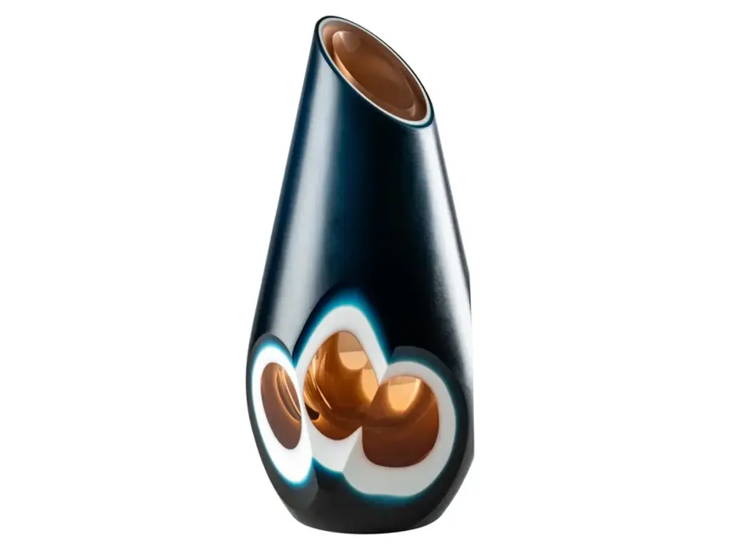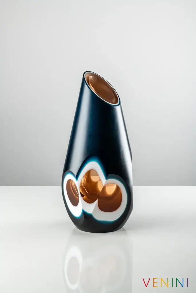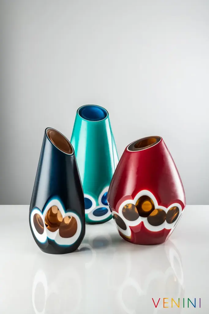 GEODI, a collection of very thick vases inspired by the mineral world, by crystals and uncut gems. Like a geode that encloses wonderful crystalline conformations within, so these rounded vases with their smooth and opaque surface, are rough-hewn at the base with deep cuts and grinding revealing smooth layers of coloured glass and polychrome fringe effects. The collection includes vases of different shapes and heights, and their colours reflect those of crystal therapy; each vase has a magical meaning, a thaumaturgical power.As a result of their technical complexity, the Geodi stress the excellence of the master glassmakers and revive the Muranese tradition and the artistic heritage of Venini, making them more contemporary and topical in their exemplification of design.Colors:Cod. 793.60 - MINT GREEN/MILK-WHITE/AQUAMARINECod. 793.61 - RED/MILK-WHITE/AMBER-YELLOWCod. 793.62 - HORIZON / PINKLimited Edition of 99 works each
