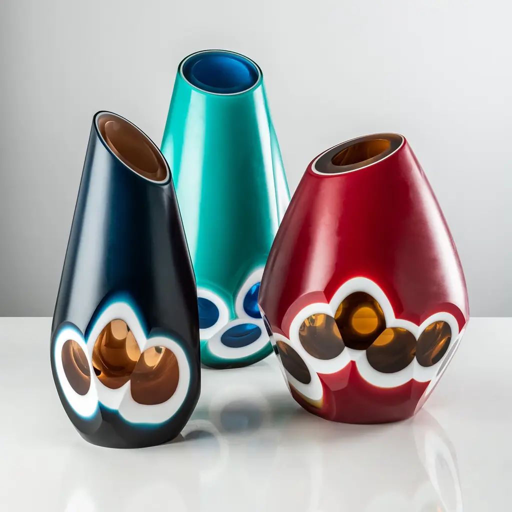 Inspired by the fascinating flair of a geode, enclosing in its hollow interior mesmerizing and precious crystals and minerals, this splendid vase is a one-of-a-kind objet d'art designed by Sonia Pedrazzini. Similarly to the volcanic rock, this vase features hollow cavities through which it is possible to admire shining and layered tones of warmly colored glass. Each vase of this series is inspired by the shapes and tones used in crystal therapy, and conceal in their elegant and sculptural silhouettes, a healing purpose.