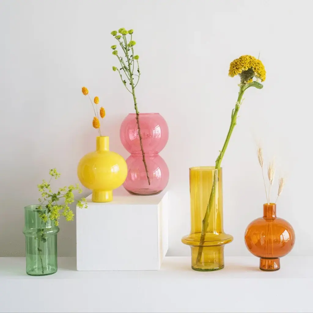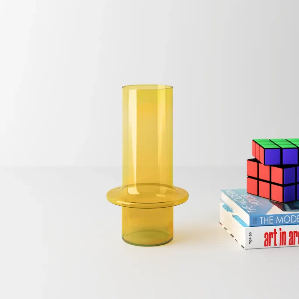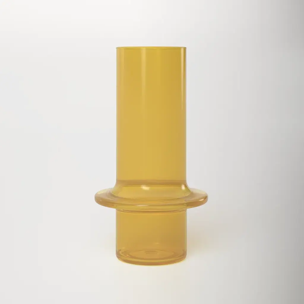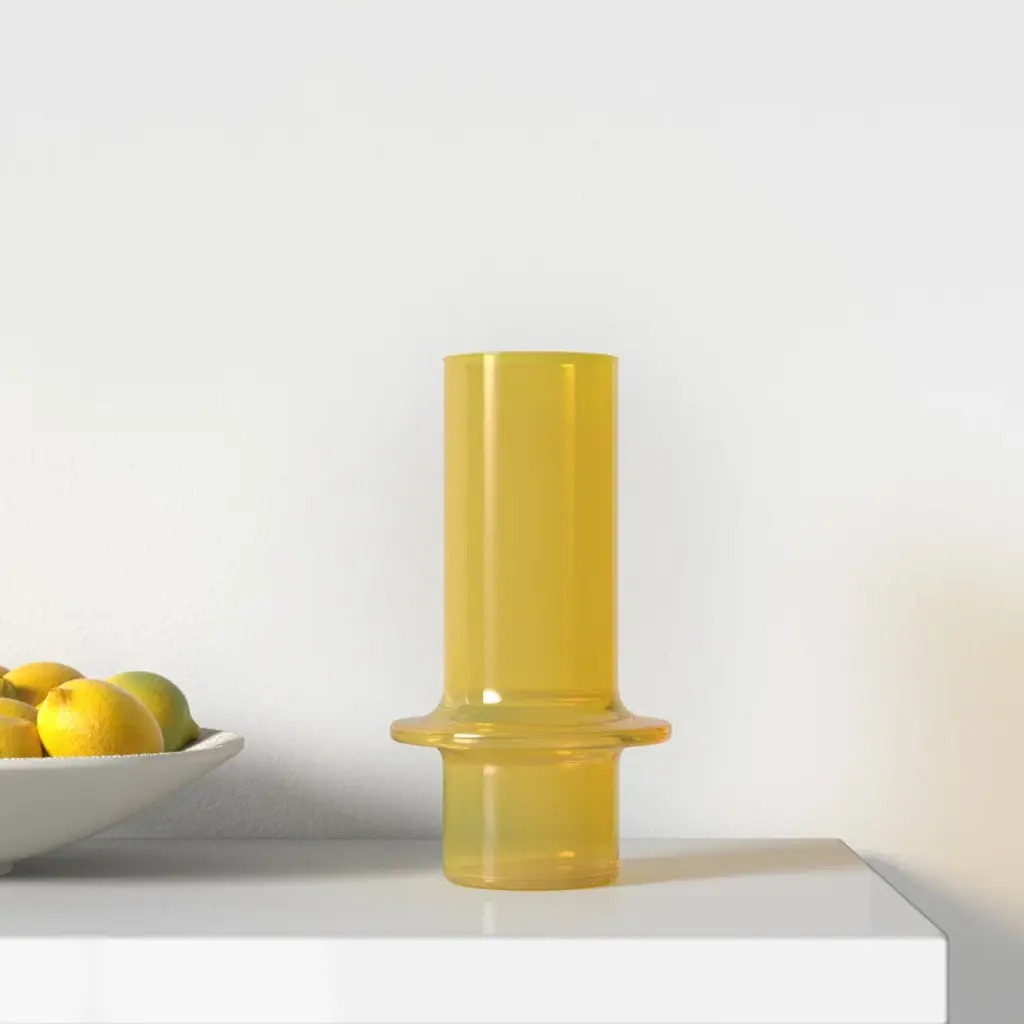 Inspired by popular Moroccan drinking glasses, this table vase displays a sleek cylindrical silhouette accented by a handle-like ring. The egg-yolk yellow tint offers sunny contrast against lush leaves or bright blooms – and vividly filters light for a decorative look even when it’s empty.
