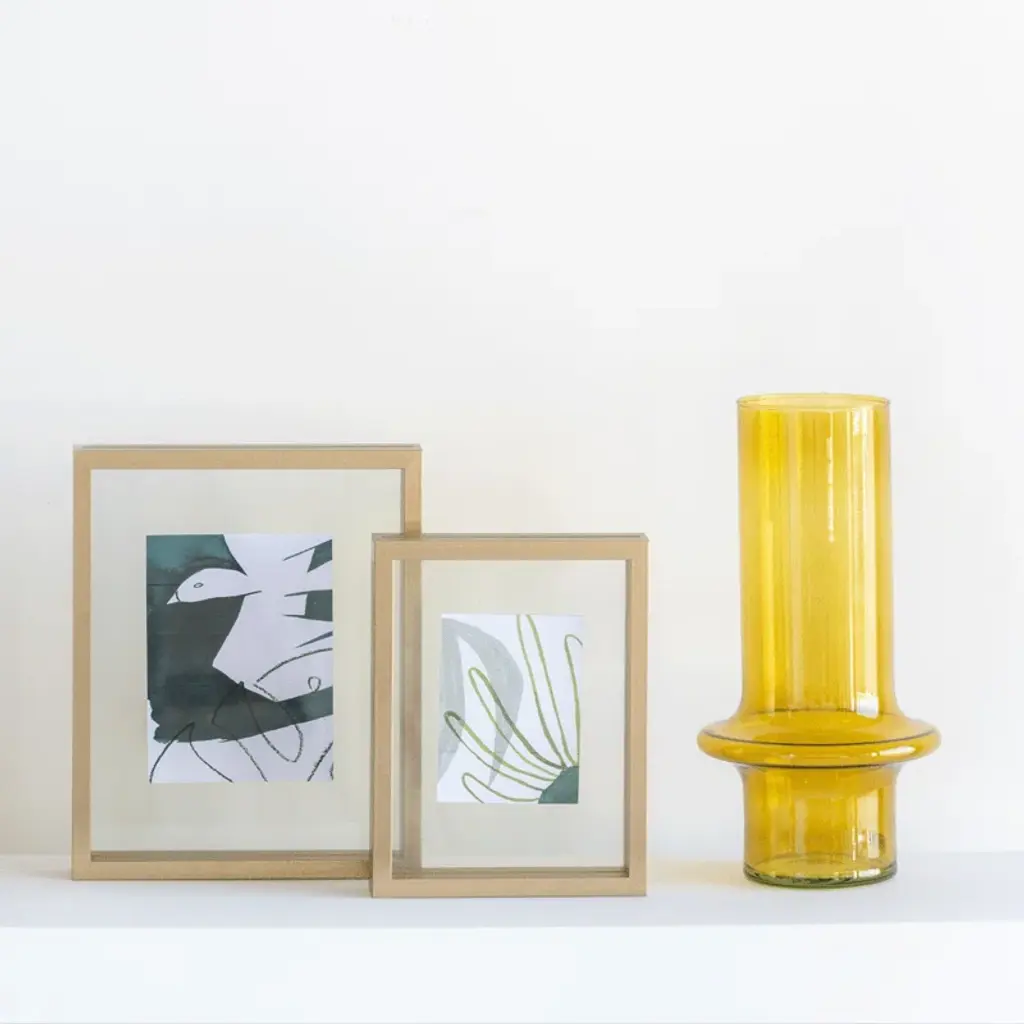 Brighten up. This glass table vase comes in a cheerful yellow hue that adds instant sunshine to any room. Nodding to Moroccan drinking glasses, it features a sleek cylindrical silhouette accented by a handle-inspired ring. The tinted glass is perfect for showcasing dried flowers or as a standalone decorative piece.