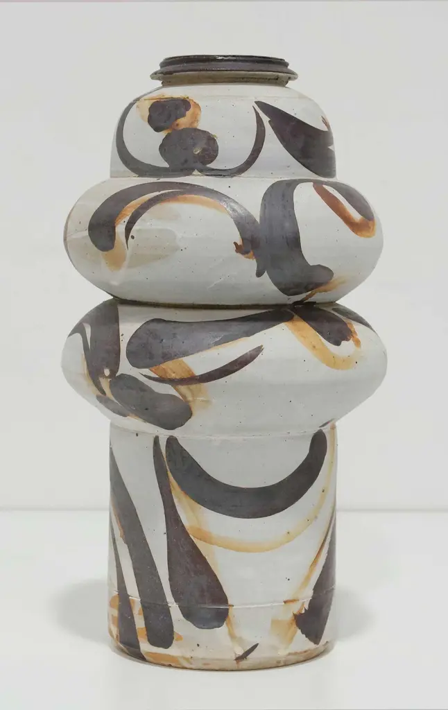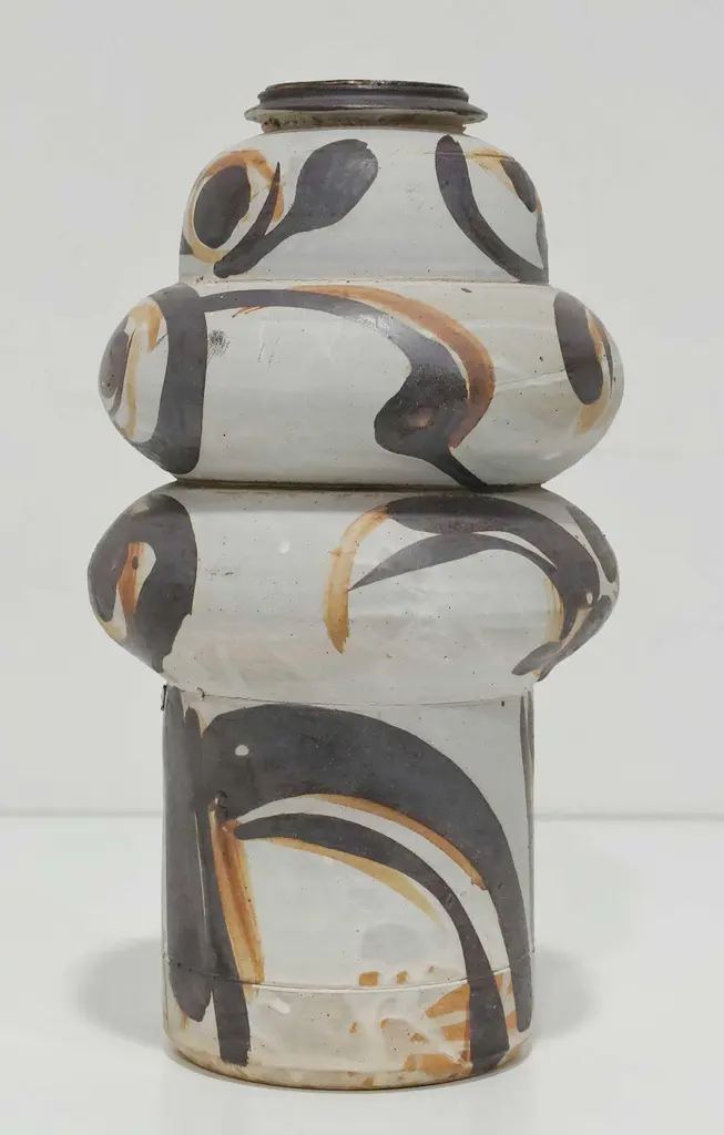 Gerry Williams is known using stoneware or porcelain to create vessels that are thrown and also for coil built sculptures. Gerry was born in India in 1926 and lived and worked in New Hampshire. In the 1950s, Gerry Williams began working in the Black Hills area of Concord, New Hampshire with the League of New Hampshire Craftsmen. He cites David Campbell, the director, as well as other potters working at the League, such as Vivika Heino, John Butler, and Richard Moll, as influential in his study. During this time, he focused on wheel-thrown pottery techniques, but soon became known for his architectural forms in porcelain and stoneware. By the 1960s, Williams was well-known and respected, and was well-versed in innovative wet-fire techniques and photoresist processes for adding images to ceramic forms. He began working with large stoneware bowls and coil-building urns. He also mastered the Copper Red Glaze during this time. As his work began to shift towards stoneware and porcelain, he created a body of well-known political sculptures, known as “Political Constructions”, which included graffiti, relief lettering, photographic imagery, effigy figures, polyester resin, and acrylic paints. In 1972, Williams and his wife co-founded The Studio Potter magazine, an international journal which became one of the most influential ceramic publications in the United States. Williams stayed on as an editor for 30 years.