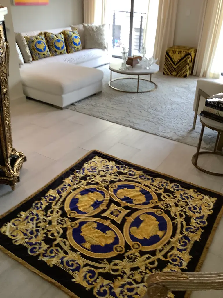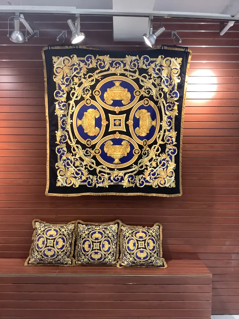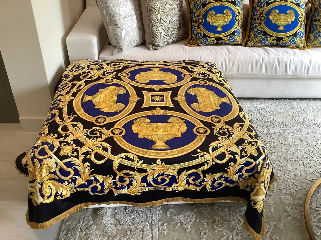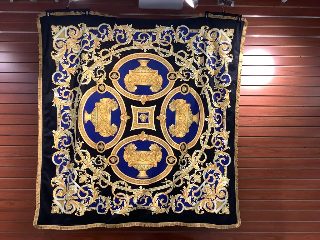 Large Gianni Versace custom made throw. The piece features a gold, blue, and black urn design with soft velvet black lining - vivid perfect condition one of kind.