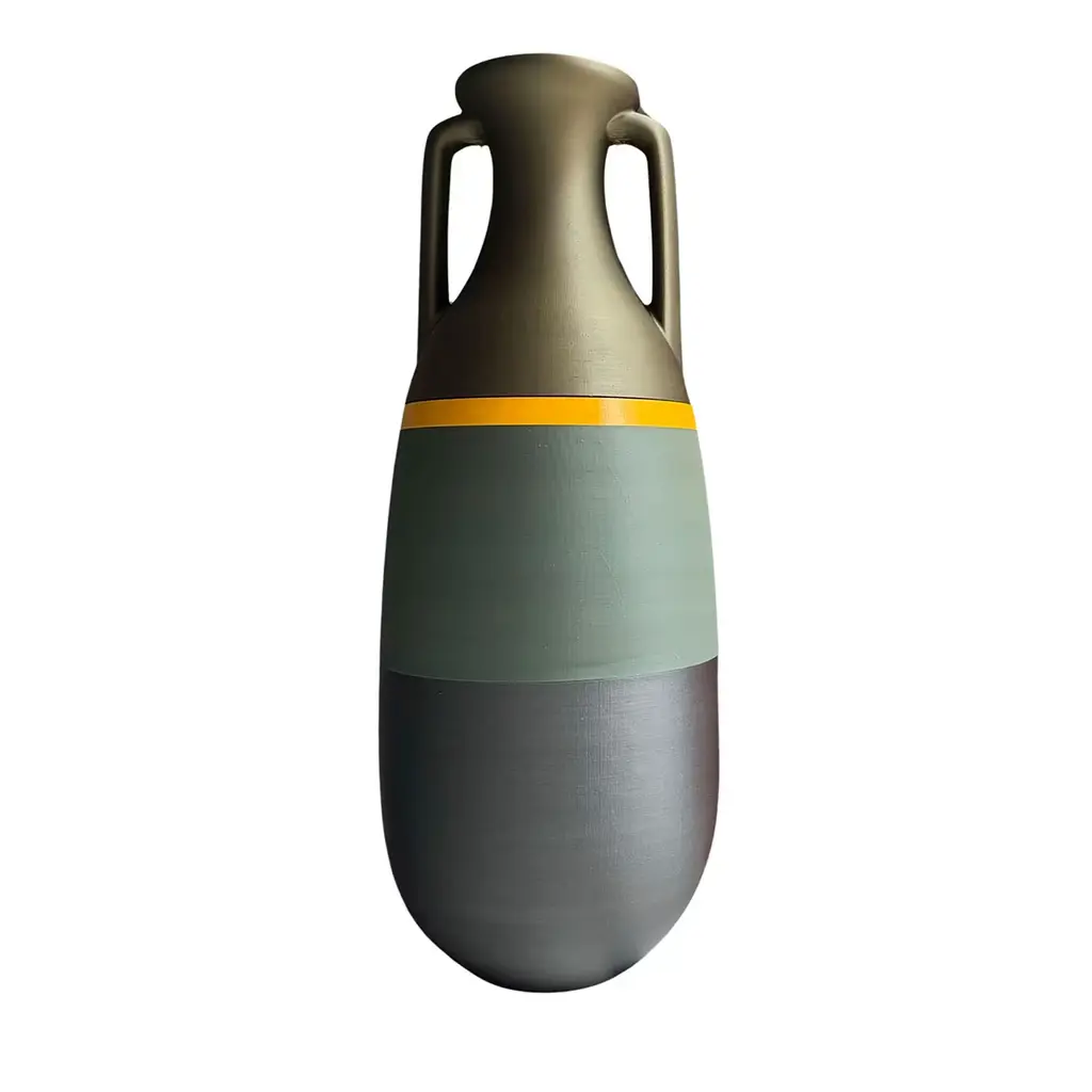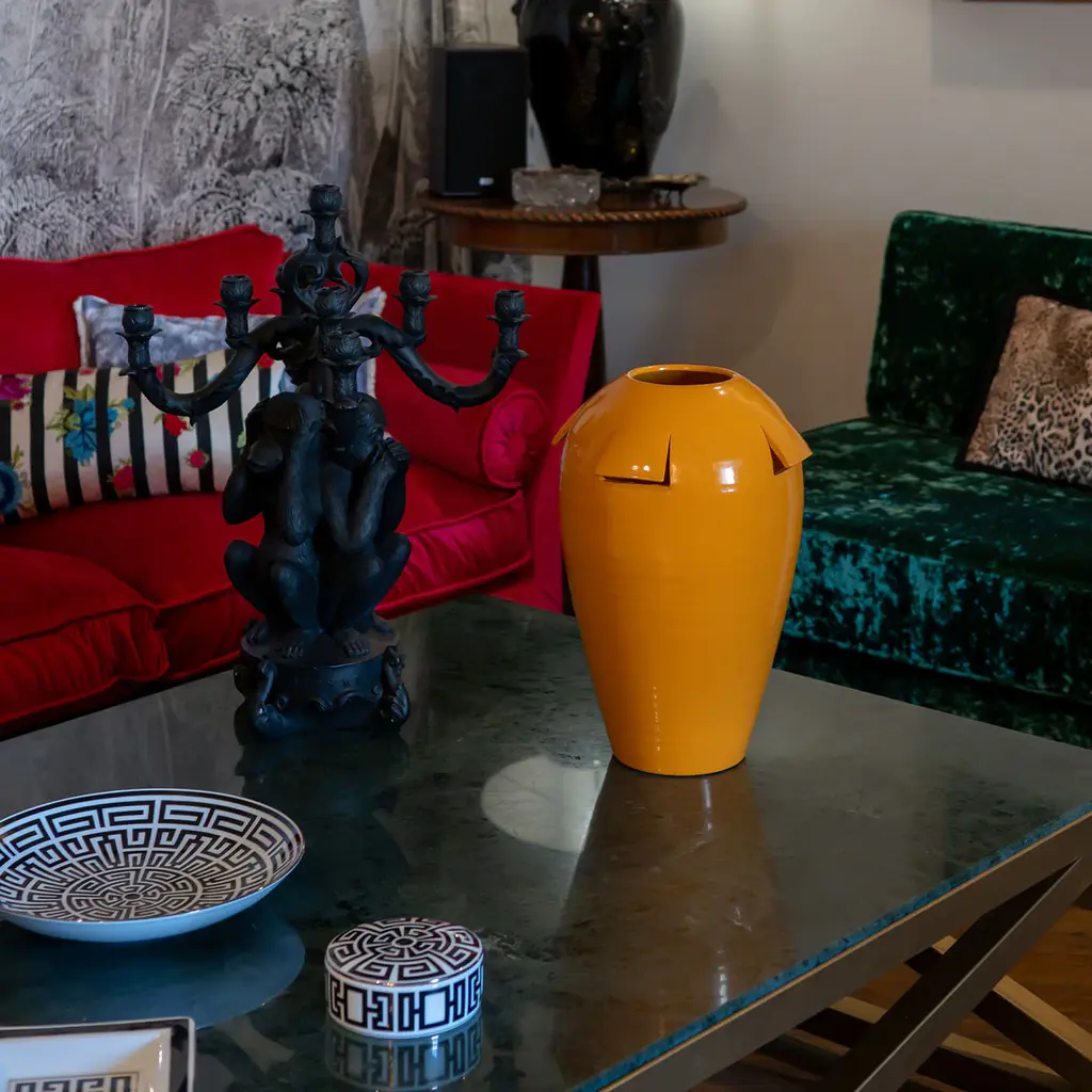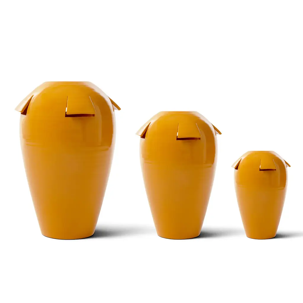 A bulging volume tapering towards the base and distinguished by tiny half-closed openings defines this one-off ceramic vase offered in a vibrant mustard tone. Featuring an intriguing, subtly wavy texture, it was conceived having in mind the idea of a deity trapped within its interior and damned to eternal crying for committing hybris. Also available in 60 cm and 90 cm versions. Contact the Concierge for more details.