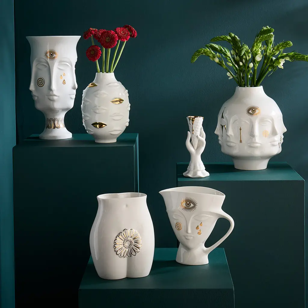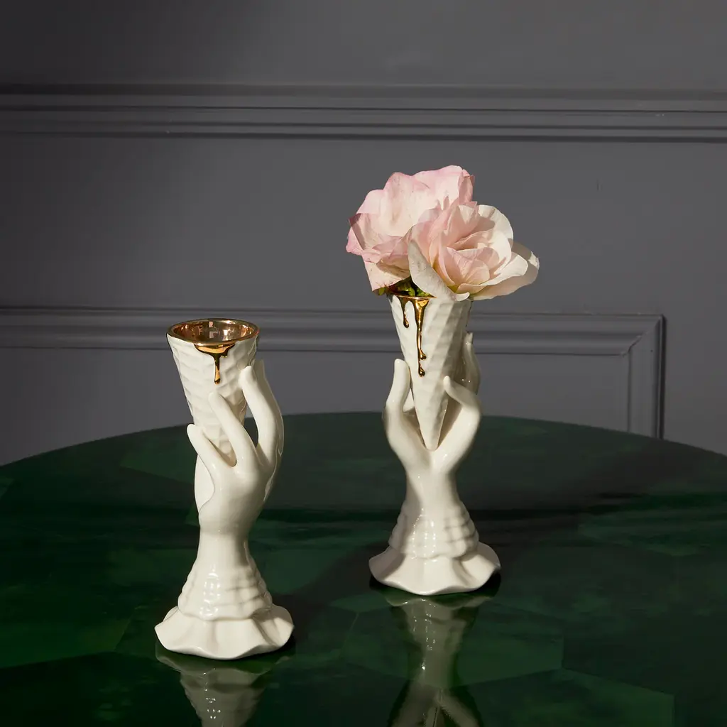 Golden Rule. Our iconic I-Scream Vase (featuring flawless, fluid lines and an Elizabethan ruff sleeve) just got another delicious detail—a lined cone dripping with gleaming, real gold glamour. Fab with a single rose or peony and just what your dining table's been begging for—a vase with powerful presence, but low enough not to block sight lines across the table. Place one per setting or group several to create a fresh centerpiece. They're also a sweet addition to your bedside table, and a perfectly playful hostess gift.