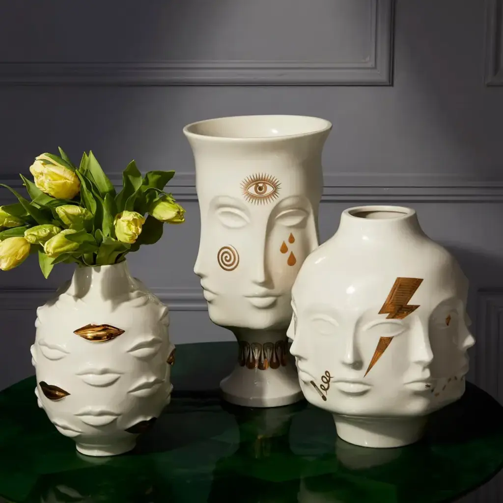 We've given our iconic Muse collection a face lift. Actually, more like a de-face lift. Subversive signs and symbols rendered in glittering gold adorn the glossy high fired porcelain pieces—signature favorites with the glamour cranked up to 11. An oversized eye-catcher, our Gilded Large Dora Maar Vase surprises from every side, no flowers required. Inspired by Dora Maar, the French photographer, poet, and painter best known for being a lover and muse of Pablo Picasso.