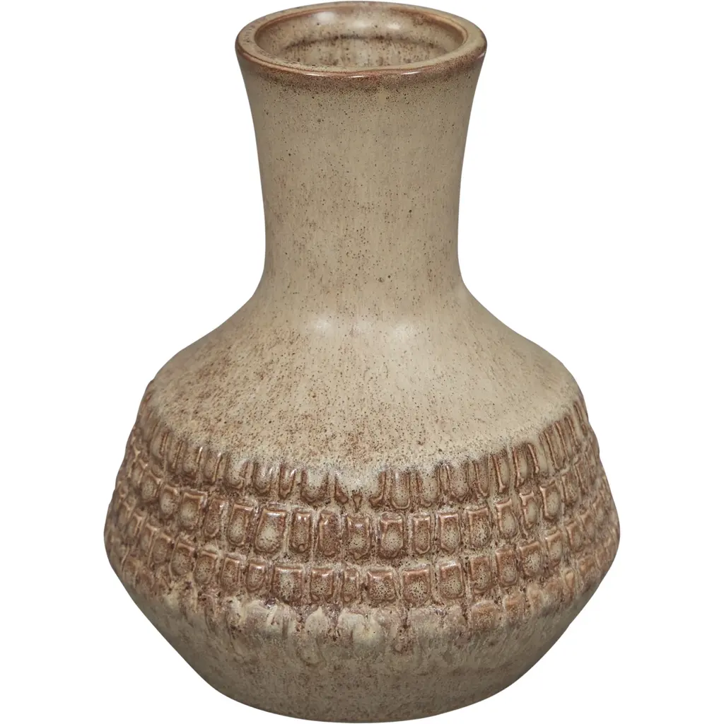 Bring a touch of textured, transitional design to your space with the addition of our Gina decorative vase. The blend of tan with pops of terracotta accent hues emphasize this piece's wonderfully tactile surface, which additionally complements the overall unique silhouette. This vase is available in three sizes including small, medium and large. Please select your size before adding to cart.