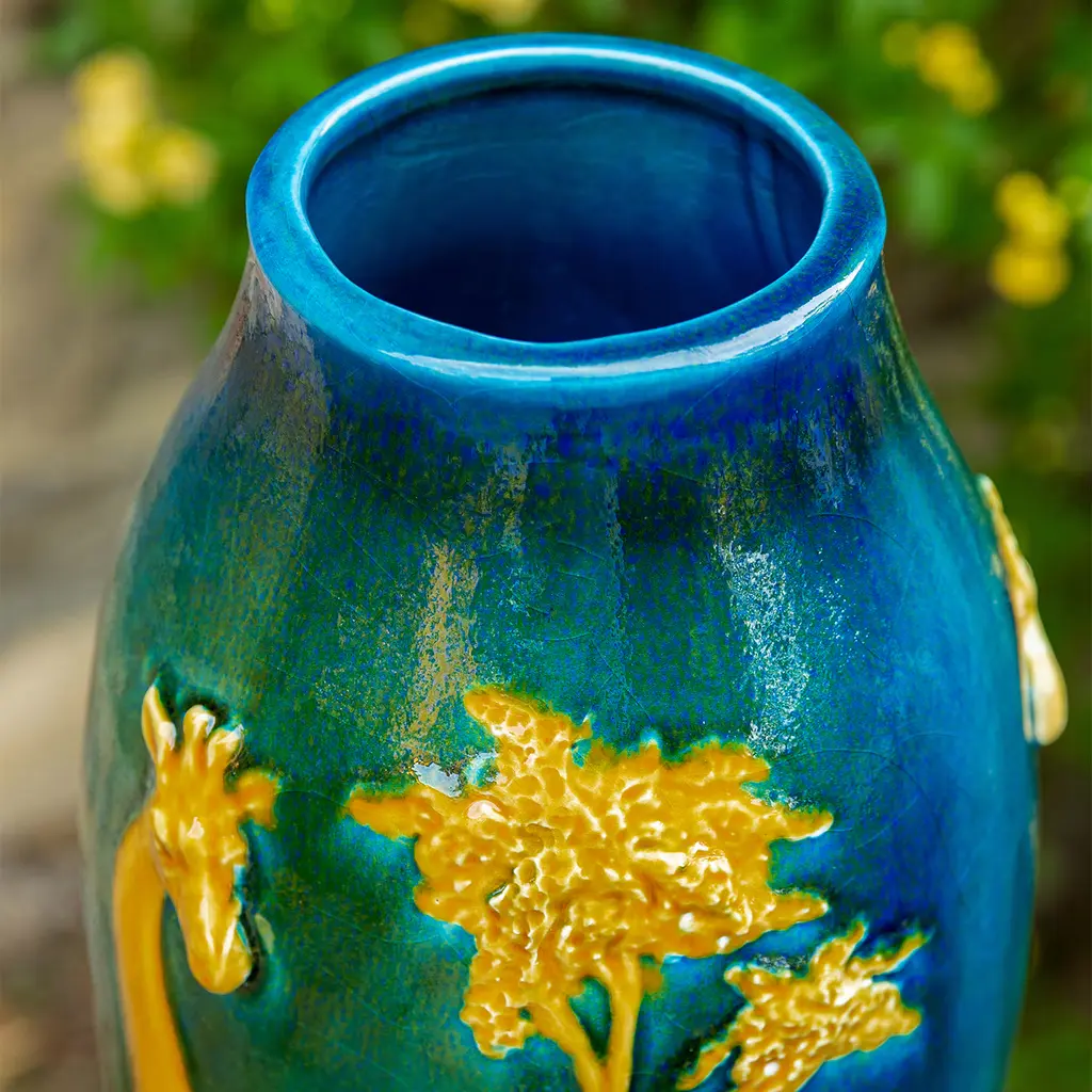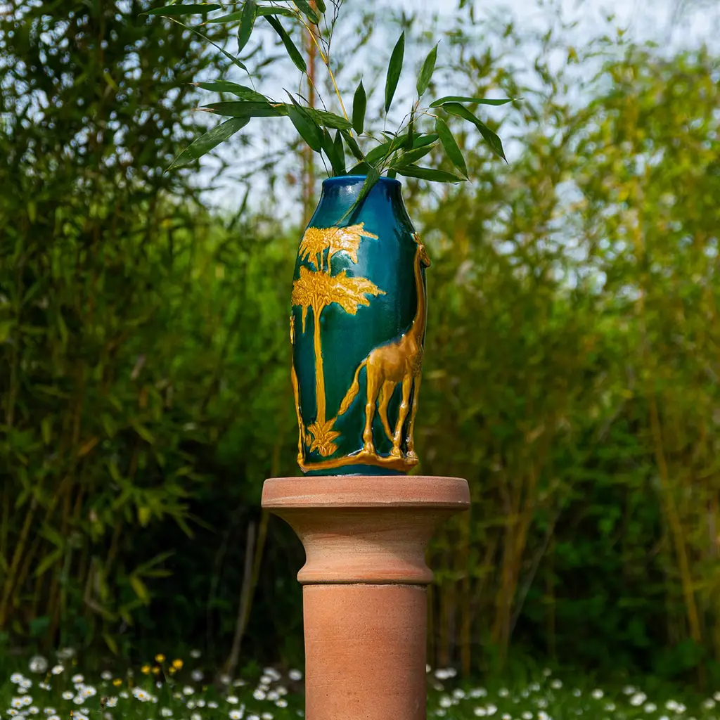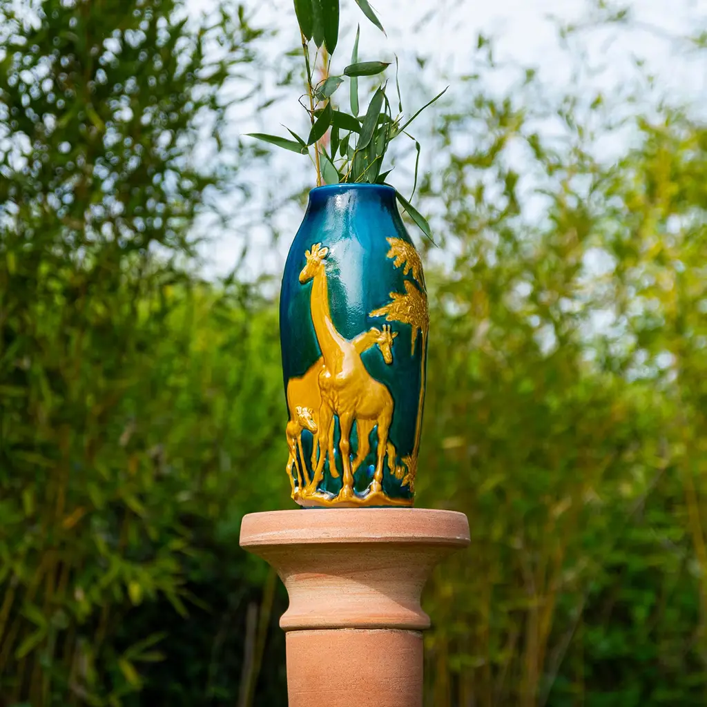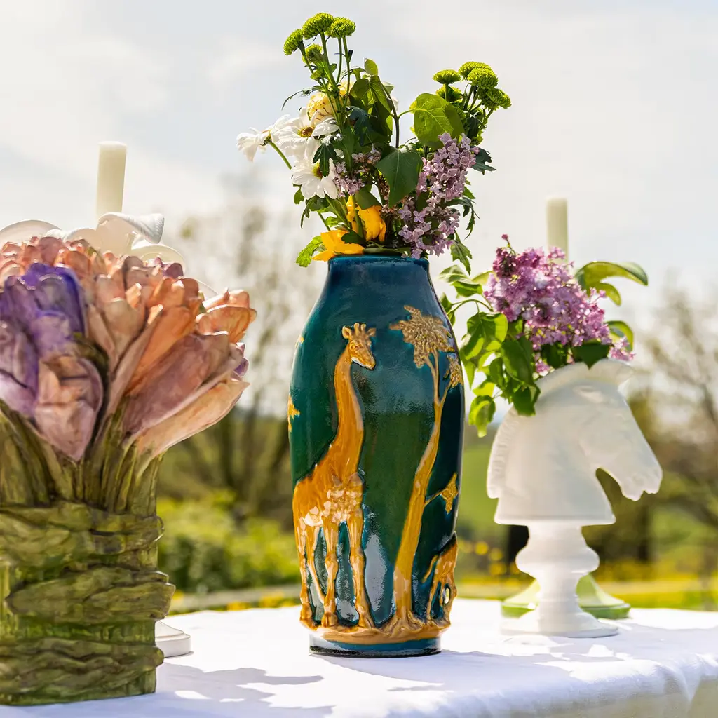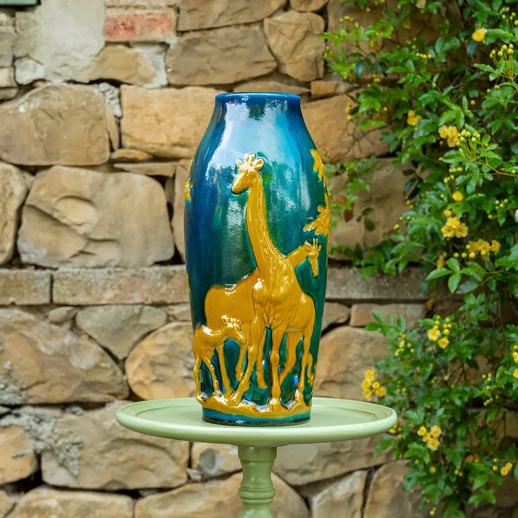 This ceramic giraffe vase embodies elegance and artistry. Handcrafted by skilled Italian ceramists, each piece undergoes meticulous hand-painting using a complex technique. This process involves dipping the vase in color and selectively removing it, creating a one-of-a-kind blend of functional sculpture. This timeless accent effortlessly complements any living space, infusing it with understated luxury and sophistication.