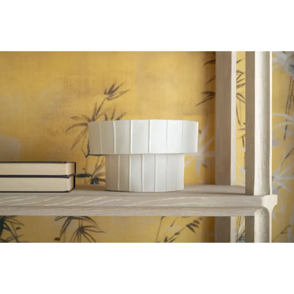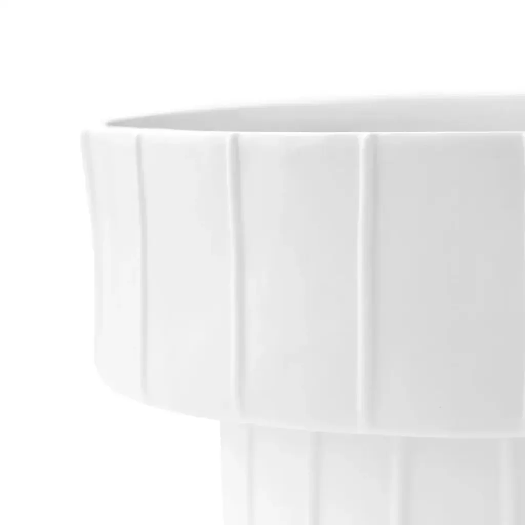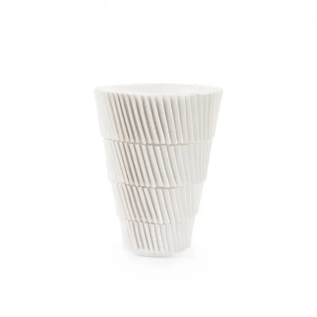Based on a traditional shape—a smaller base with a wider top—the Girasol Vase is inspired by architectural constructivism which highlights materials and construction. In this vase, delicate strips of Blanc de Chine porcelain have been seamed together in a way which emphasizes its hand-made qualities. Produced by craftsmen descended from the same ones which created masterpieces for the imperial court, the Girasol combines very old traditions with contemporary aesthetics. It has a glossy interior finish and a matte exterior. The Girasol makes the perfect catchall in your entryway, a lovely fruit bowl in the dining room, or a stunning sculptural piece on a sideboard or etagere.