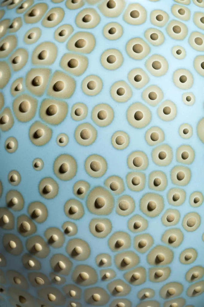 Glacier Hesse Pasteur vase by Elyse Graham.Dimensions: W 20 x D 20 x H 23 cm.Materials: plaster, resin.Molded, dyed, and finished by hand in LA. Customizationavailable.All pieces are made to order.Our Microbe Collection is inspired by the unique galaxy of microorganisms living within each of us. We created a technique for dying and stippling each vase that evokes the nature of microbes as they grow and colonize . Each vase is hand-cast with hydrocal plaster inside of a unique balloon shape. The interior of each piece is poured with layers of resin, making it waterproof. Finally, each vase is hand-dyed with custom mixed pigments and finished with a unique pattern of dyed plaster protuberances. The exterior of each vase is sealed with a UV resistant acrylic coating. These vases are all handmade and will vary slightly in shape, size, color and pattern.Founded in 2014 and based in Los Angeles, the Elyse Graham Studio is a place where unusual materials and experimental processes are implemented to create a melding of art and object. We design by making—with an emphasis on capturing the unique properties of the materials we use through exploration and innovation. Each piece we make is non-repeating and completely individual. We have intentionally designed every process we use — from how we mix our colors to how we cast our forms to highlight and celebrate the time-based, made by hand quality of our work. All of our pieces require a specific kind of care and attention at every level of production. At the core of our studio is our endless fascination with inviting the unknown into our work and exploring our passion for creating pieces that tell a story— about the materials they are made of, the artists who make them and the homes they live in. Each piece is a journey, come along with us.MEET OUR TEAMElyse Graham is the founder and creative director of the studio. Driven by Elyse’s unique vision of building a studio that fosters and emphasizes connection, play, and experimentation (of people, processes, and in turn the objects created and shared) our small team works closely and collaboratively on each project. Elyse received a BA in sculpture and semiotics at Brown University. After years of making sculpture and running a business in jewelry design, Elyse decided to merge her separate practices and redirect her attention toward collectible design in 2013. The creative trajectory of the studio is heavily influenced by Graham’s background in fine art, specifically her interest in process-driven and material-based artwork. The studio’s vocabulary of shapes, patterns, and forms comes from a lineage of unconventional processes Graham has developed and built for working with plaster and resin. Graham shares her studio as well as her home with her husband, Lewis Mauk and their daughter, Eero. Miller Robinson is head of our production department. From pigmenting and casting materials for all of our products in plaster and resin to graphic and production design, they wear many hats in our studio. Miller joined our team in 2014 and has been an integral part of designing many of our experimental processes that have lead to the creation of our unique MetaMATERIAL. Like Elyse, Miller has a background in material and process-oriented making, which led to an instant connection and collaborative understanding between the two. Miller received their BFA from Otis College of Art and Design with a focus on painting, installation, performance, and writing. Their individual art practice focuses on the preservation and potentialities of underrepresented histories and encompasses objects, garments, actions, tattooing, and books. Their personal work has been exhibited in Los Angeles at the Southwest Museum, Los Angeles Municipal Art Gallery, Heritage Square Museum, and with Los Angeles Contemporary Exhibitions (LACE), as well as HORESEANDPONY Fine Arts in Berlin.Lewis Mauk is our studio and operations engineer. Working on facilities and production design as well as engineering and leading all of our large-scale constructions and installations, Lewis’ unique set of technical skills gives form and structure to our studio’s unconventional ideas and processes. Lewis has been working behind-the-scenes since the creation of the studio but joined our team full-time in 2020. Consistent with the rest of our team, Lewis has a background in process-driven fine art and has extensive training in woodworking, printmaking, and photography. He received a MFA from CalArts and has worked across the fields of education and fabrication. Lewis’ combined interest in the creation of personal archives mixed with his commitment to sustainable life practices, has brought a focus and important emphasis on designing studio projects and processes that imagine ways to reduce and reuse studio material fragments.