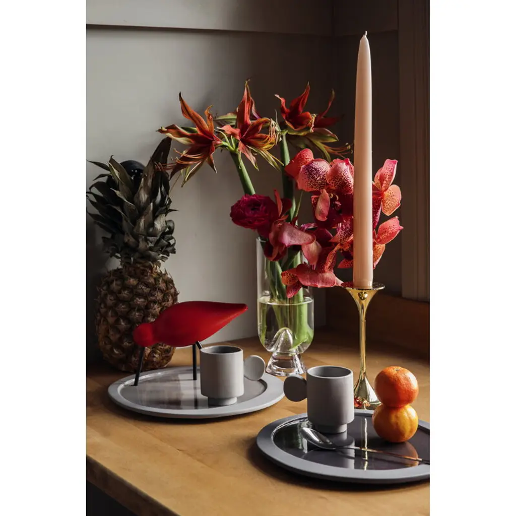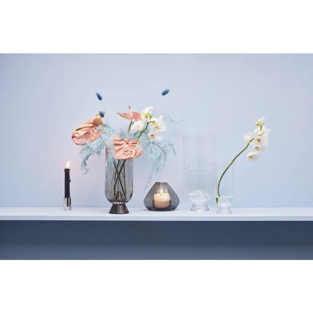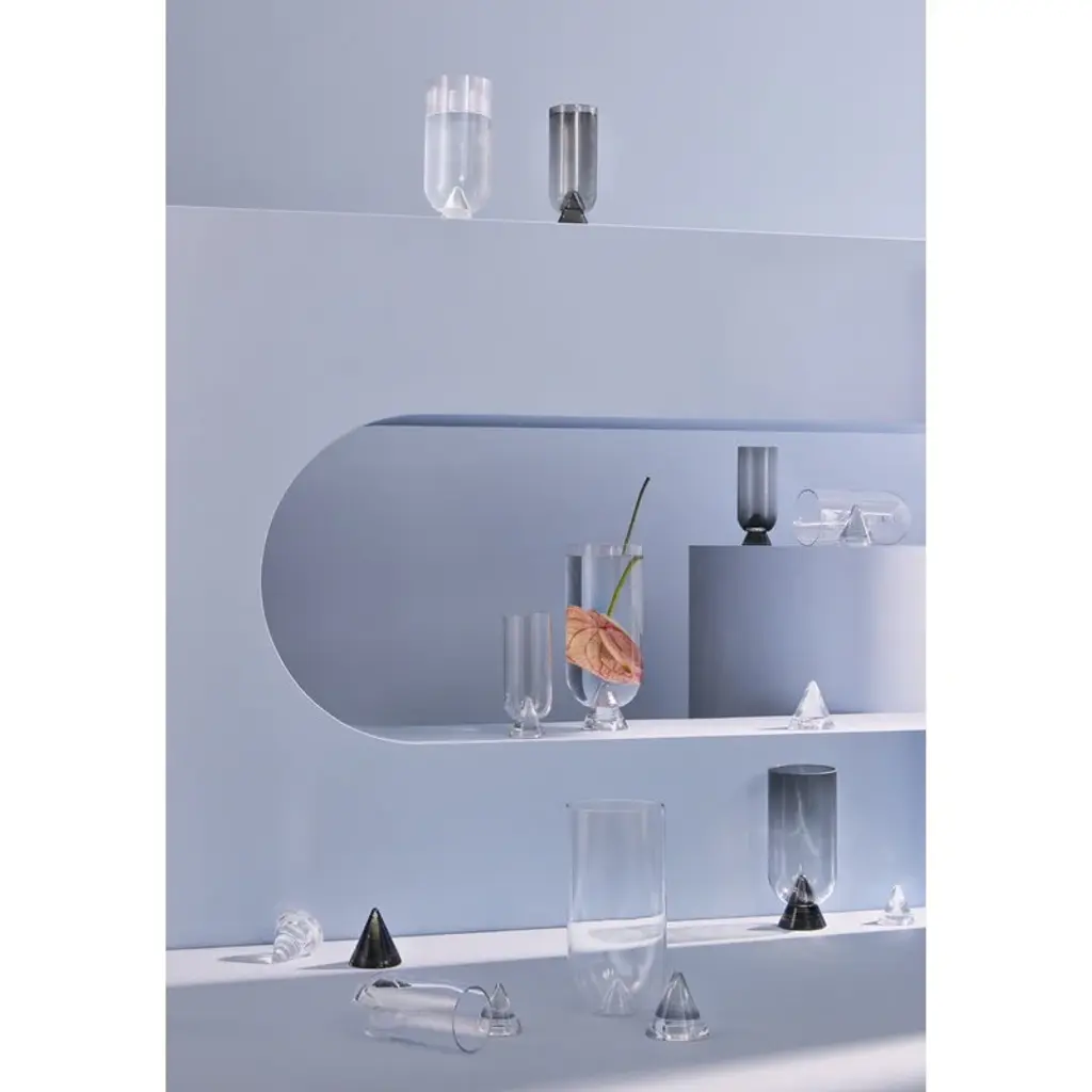 The Glacies vase by AYTM got its name from icebergs: the vase’s cone-shaped base does indeed resemble a piece of ice, the peak of which beautifully pierces through the cylindrical water container. Made of mouth-blown glass, the Glacies vase is a fascinating combination of geometric shapes and textures, and it makes a charming piece both empty or when filled with flowers or green branches. The sculptural vase is also well suited as a gift.