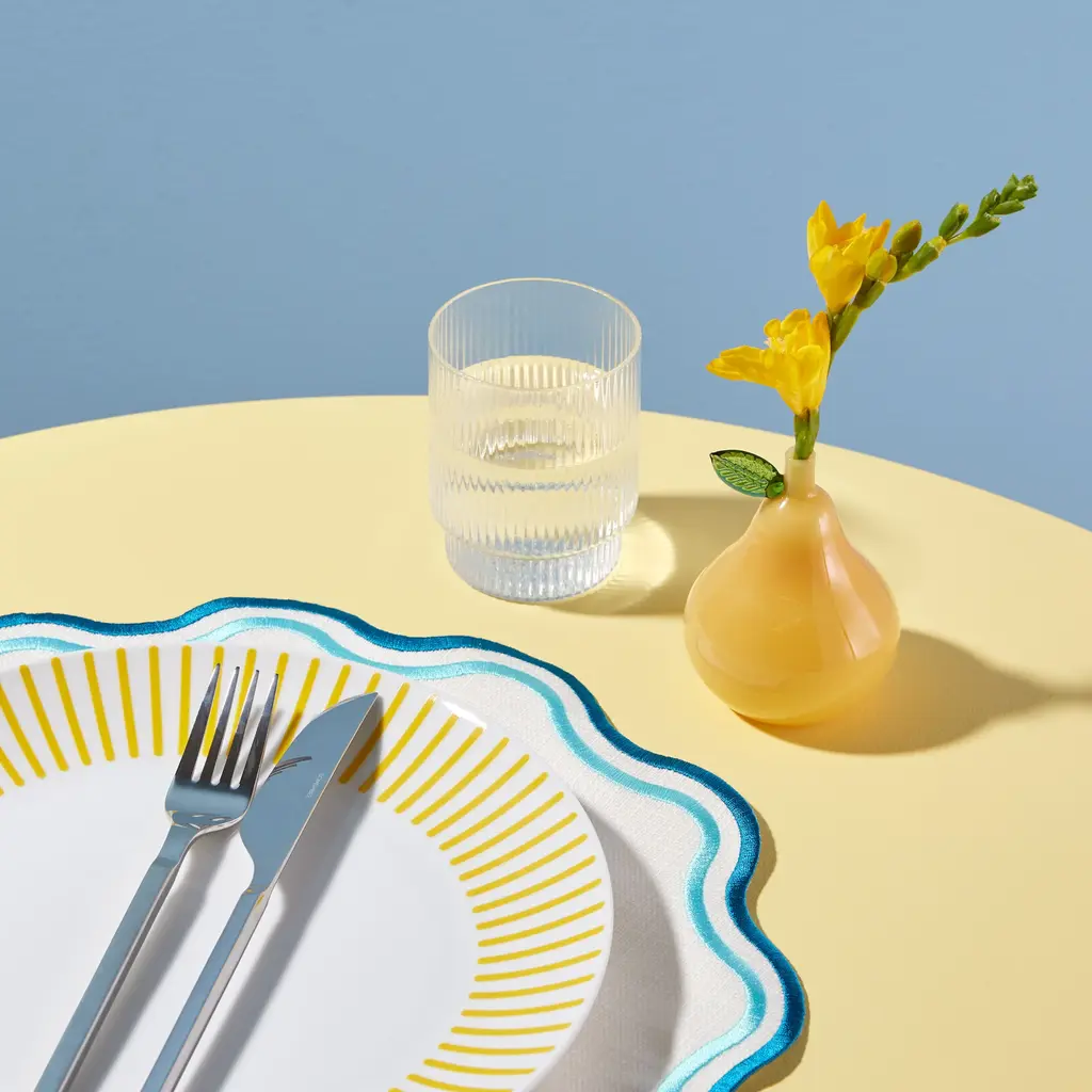Cute and a little quirky, this bud vase mimics a pear with yellow borosilicate glass and a green-glass leaf accent. It’s perfect for displaying one gorgeous flower or as an everyday art object anywhere in your home. It measures 3.75h x 2.75”diam. Hand wash recommended.