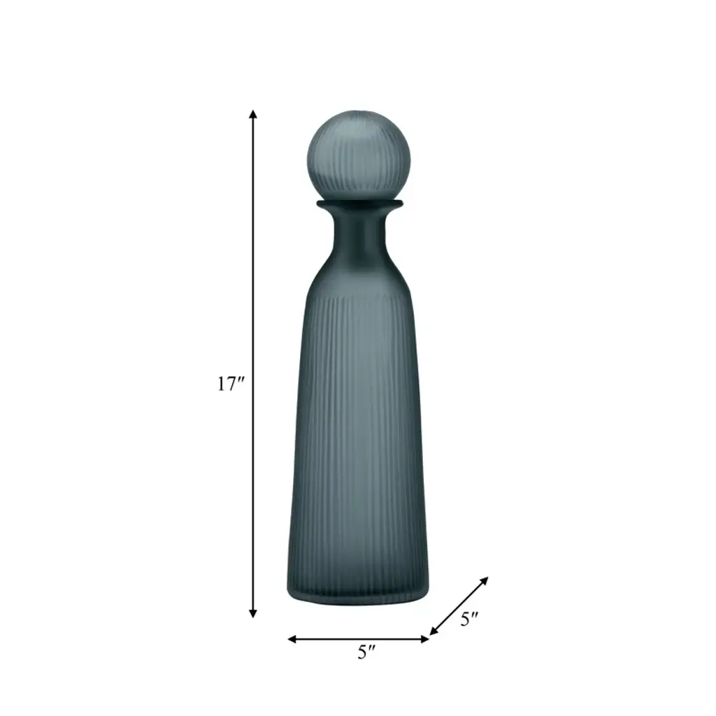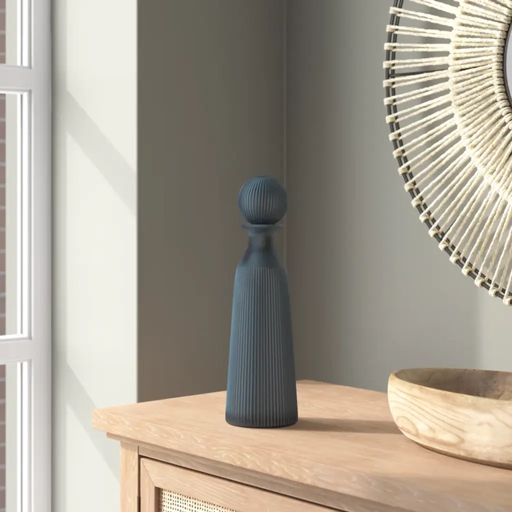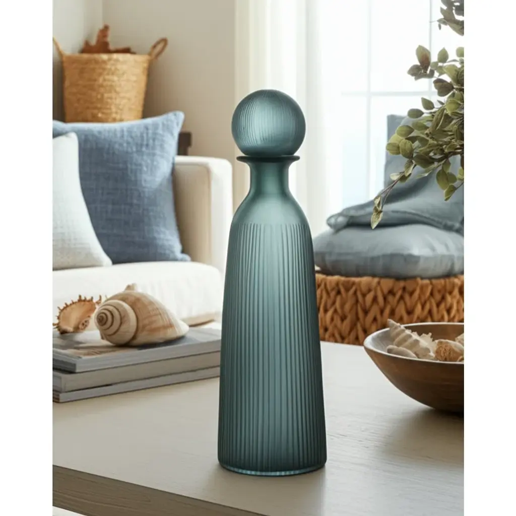 Glass Vase With Vertical Ribbed Detailing And Round Stopper Accent Aligned To Coastal Trend For Modern Decorative Display In Contemporary Interior Settings.