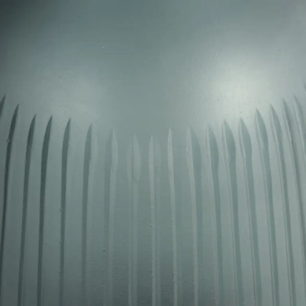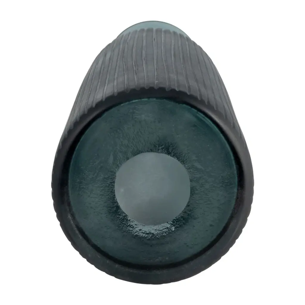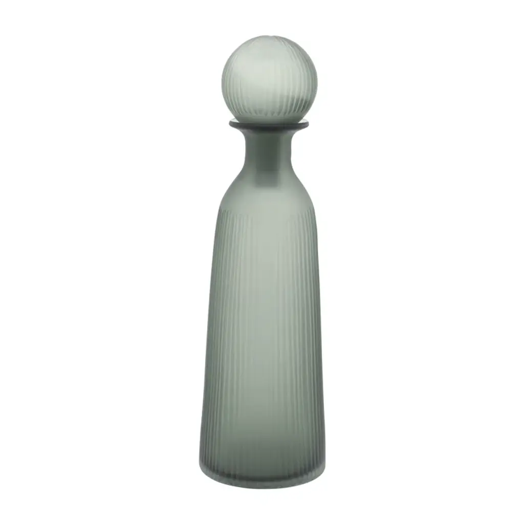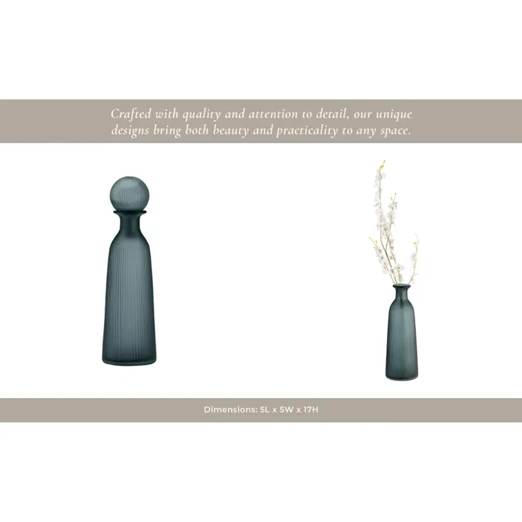 Glass Vase With Vertical Ribbed Detailing And Round Stopper Accent Aligned To Coastal Trend For Modern Decorative Display In Contemporary Interior Settings.