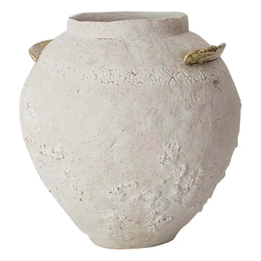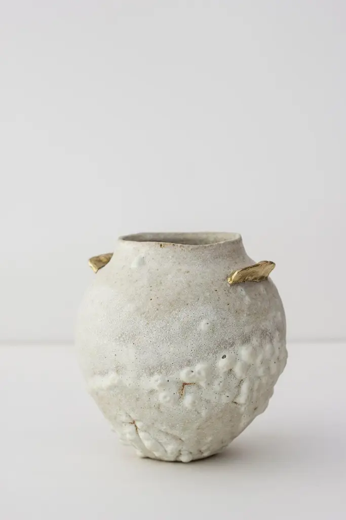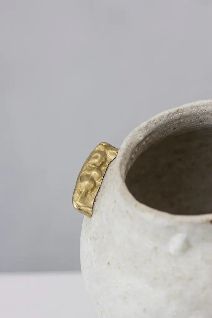 Glaze "Isolated n.10" stoneware vase, Raquel Vidal and Pedro Paz.Dimensions: 23 x 21cm.Materials: Hand sculpted, glazed pottery, brass.Raquel Vidal and Pedro Paz Craft pottery and jewelry that seeks to preserve ancient techniques and aesthetics. Their work is defined by a deep respect for materials, metal and clay being the primary raw materials with which they work. Both of these elements have been used since the beginning of humanity to not only make tools and supplies but also for creating objects to contemplate and connect with our bodies and environment. Pottery and jewelry have worked together in each society’s development, mutating and showing the interests, needs and concerns of a given era.Raquel and Pedro believe these ancient arts also help us understand our ancestors, get closer to them and experience how they felt materials and shapes. The Material connections between metal and clay are also of interest. Both materials have long and slow production processes and an intimate connection with fire, a somewhat rebel and magic element, that humanity has always craved to control.This belief that materials and the processes applied to them can transform the artist into a restorer of old sensibilities is foundational for Raquel and Pedro. Every piece is crafted slowly and methodically, there is no rushing in the process, and with a respect for the natural worl's own "will" to produce its own results.