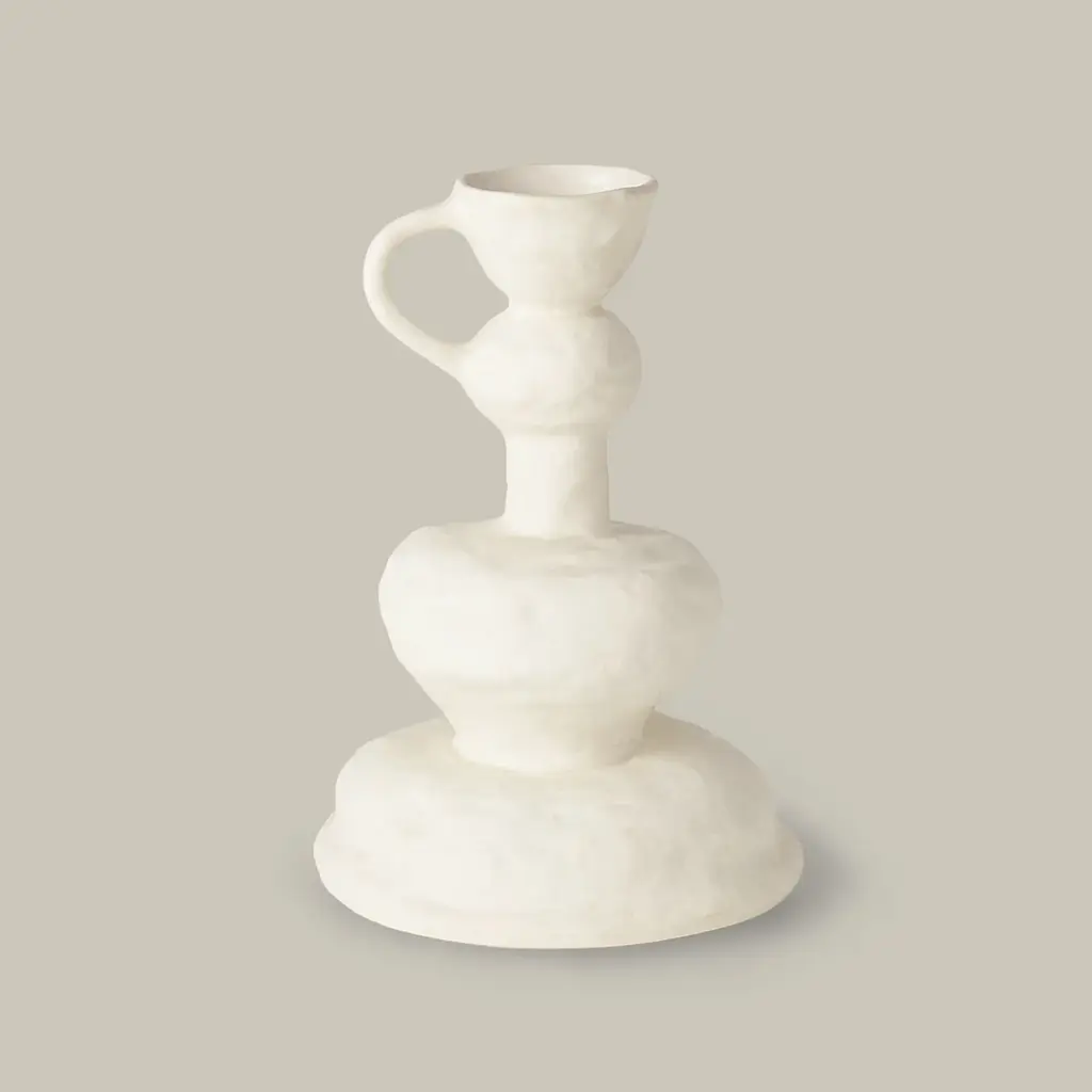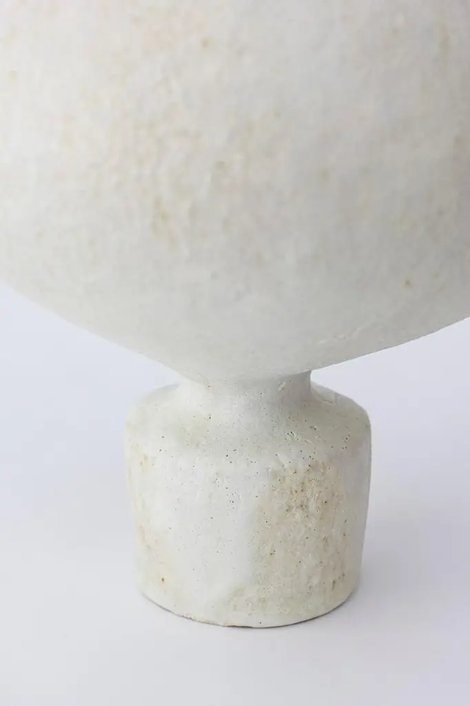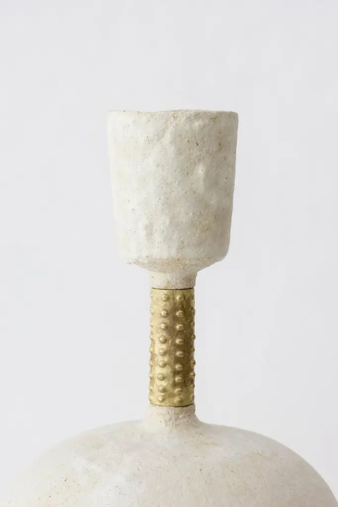 Glaze "Isolated n.14" stoneware vase - Raquel Vidal and Pedro PazDimensions: 43 x 22cmMaterials: Hand-sculpted, glaze stoneware, brass Raquel Vidal and Pedro Paz Craft pottery and jewelry that seeks to preserve ancient techniques and aesthetics. Their work is defined by a deep respect for materials, metal and clay being the primary raw materials with which they work. Both of these elements have been used since the beginning of humanity to not only make tools and supplies but also for creating objects to contemplate and connect with our bodies and environment. Pottery and jewelry have worked together in each society’s development, mutating and showing the interests, needs and concerns of a given era.Raquel and Pedro believe these ancient arts also help us understand our ancestors, get closer to them and experience how they felt materials and shapes. The Material connections between metal and clay are also of interest. Both materials have long and slow production processes and an intimate connection with fire, a somewhat rebel and magic element, that humanity has always craved to control.This belief that materials and the processes applied to them can transform the artist into a restorer of old sensibilities is foundational for Raquel and Pedro. Every piece is crafted slowly and methodically, there is no rushing in the process, and with a respect for the natural world’s own "will" to produce its own results.