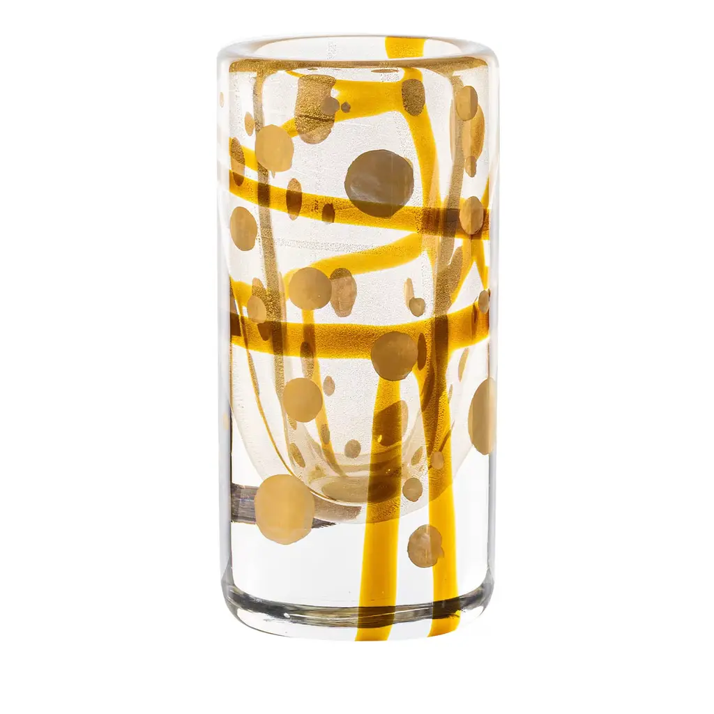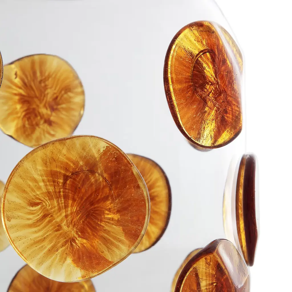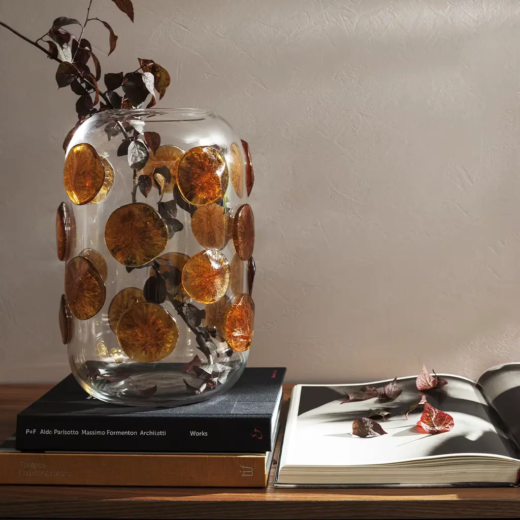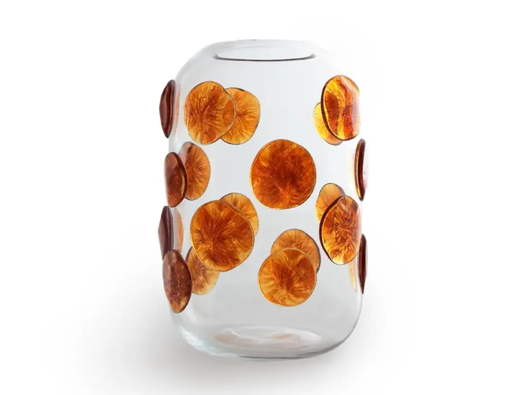 A true objet d'art handcrafted by master glassblowers in Murano glass, this vase is an exercise in ethereal grace combined with seductive amber accents. Authentic amber drops get carefully applied by hand onto the vase's bulging and perfectly clear silhouette, resulting in dots of striking textural and chromatic contrast.