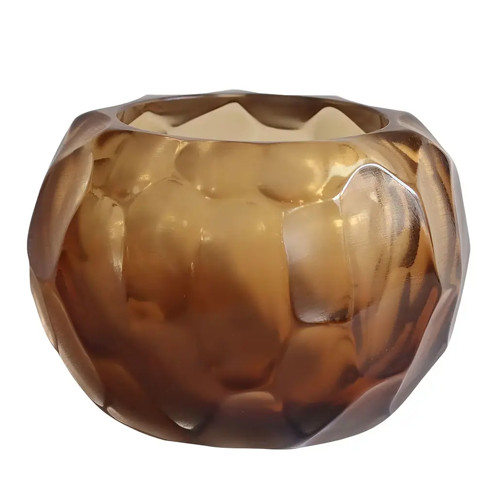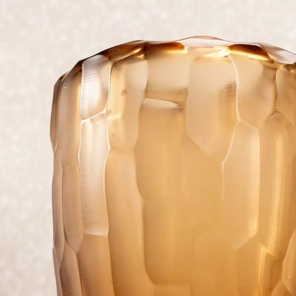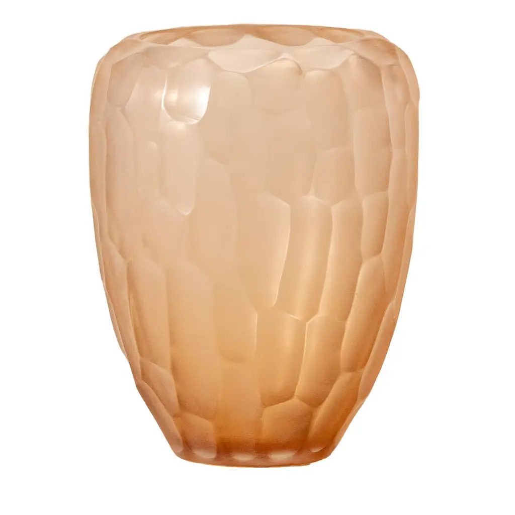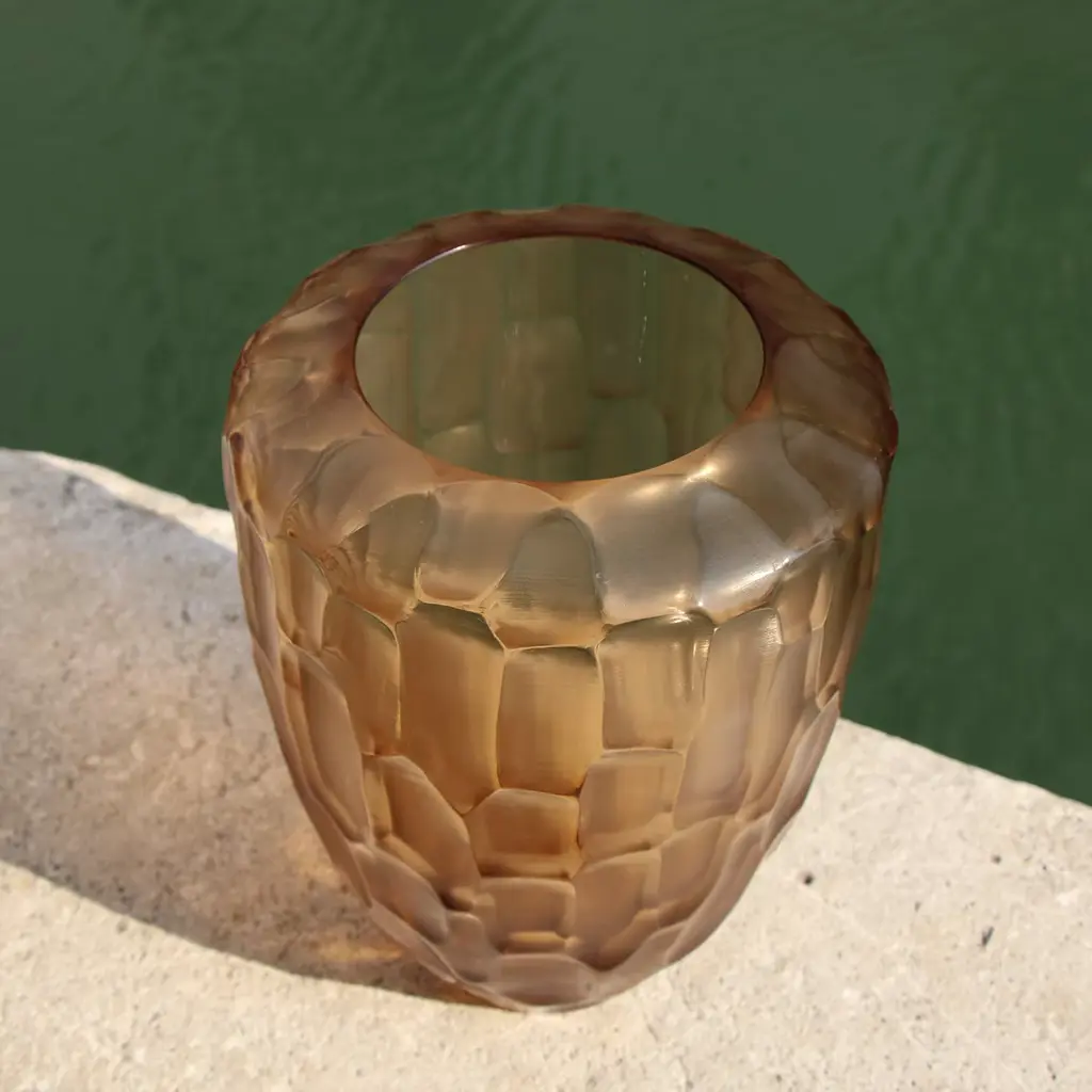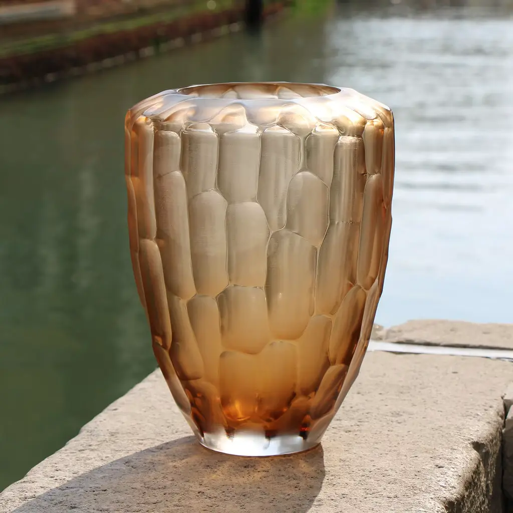 Inspired by the ancient amphorae, this vase resembles the elongated form of a drop – which in Italian translates as Goccia. Following the blowing process the vase is engraved and polished producing a vibrant faceted surface. It is made by the Molatura technique which takes its name from the grinding wheel used to carve the cold glass, which in Italian is called “Mola”.