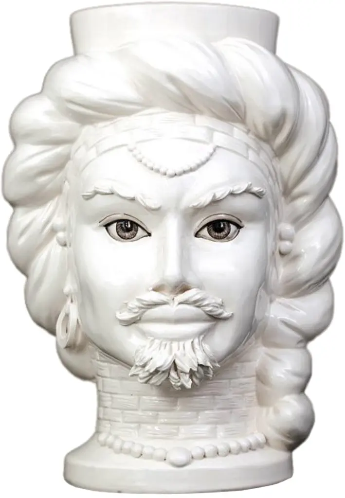 The CollectionThis collection offers ideas for contemporary décor through sophisticated revelations of art bound to the tradition of ceramics of Caltagirone, objets d’art that combine history and design.The extreme attention to details, supported by twenty years of experience of master craftsmen, is the company’s strength.The production technique hides secrets and art mixtures that make the product unique and exclusive. Mosche Bianche chooses to combine art and design to recall history through ceramic artworks in doing so, history revives, as in a fairy tale, an incredible civilization that is the sicilian culture.The moorish heads in ceramics, tribute to the beauty of ancient Sicily and its traditions, draw inspiration from a legend of love and jealousy set during the arabic domination in Sicily.A Story Of Love And JealousyThe legend tells that during the moorish domination in Sicily around 1000, in the arabic district of Palermo “al hàlisah” that a moor who, overwhelmed by a violent passion, declared his love to her. Noticed means “the chosen one”, a sweet girl the young girl charmed by his promise of love reciprocated. However, the moor was hiding a terrible truth. He already had a wife and children back home. So, when the girl discovered it, she decided to keep his beloved face with her forever. Without hesitation, she cut off his head and create a vase in which she planted a basil shoot. This aromatic plant has always had an aura of holiness as it represents the rulers’ plant. In this sense, that terrible act was justified by her absolute love to continue to take care of her beloved young moor. Every day in fact, the tears of the young heart-broken girl watered the plant of basil that kept thriving and flourishing. And all the neighbours, inebriated by that sentof the beautiful plant, started to commission clay vases shaped as a moor head.This piece is available with Crown or Without:Sizes: (D - H)With crownS 16 x 24 cm - 5.90 x 9.45 incM 26 x 40 cm - 10.23 x 15.74 incL 32 x 50 cm - 12.59 x 19.68 incWithout crownS 16 x 22 cm - 6.29 x 8.66 incM 26 x 35 cm - 10.23 x 13.77 incL 32 x 46 cm - 12.59 x 18.11 inc.