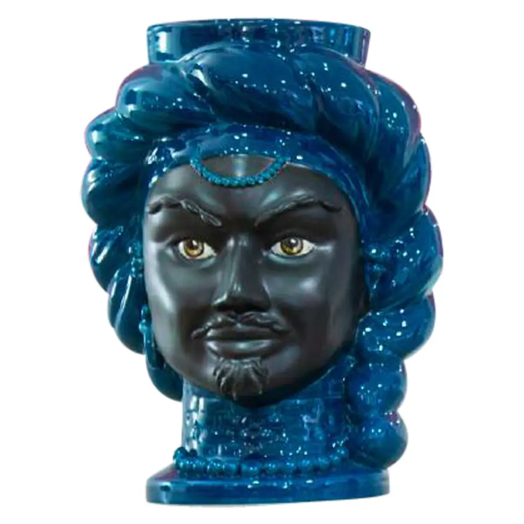 The CollectionThis collection offers ideas for contemporary décor through sophisticated revelations of art bound to the tradition of ceramics of Caltagirone, objets d’art that combine history and design.The extreme attention to details, supported by twenty years of experience of master craftsmen, is the company’s strength.The production technique hides secrets and art mixtures that make the product unique and exclusive. Mosche Bianche chooses to combine art and design to recall history through ceramic artworks in doing so, history revives, as in a fairy tale, an incredible civilization that is the sicilian culture.The moorish heads in ceramics, tribute to the beauty of ancient Sicily and its traditions, draw inspiration from a legend of love and jealousy set during the arabic domination in Sicily.A Story Of Love And JealousyThe legend tells that during the moorish domination in Sicily around 1000, in the arabic district of Palermo “al hàlisah” that a moor who, overwhelmed by a violent passion, declared his love to her. Noticed means “the chosen one”, a sweet girl the young girl charmed by his promise of love reciprocated. However, the moor was hiding a terrible truth. He already had a wife and children back home. So, when the girl discovered it, she decided to keep his beloved face with her forever. Without hesitation, she cut off his head and create a vase in which she planted a basil shoot. This aromatic plant has always had an aura of holiness as it represents the rulers’ plant. In this sense, that terrible act was justified by her absolute love to continue to take care of her beloved young moor. Every day in fact, the tears of the young heart-broken girl watered the plant of basil that kept thriving and flourishing. And all the neighbours, inebriated by that sentof the beautiful plant, started to commission clay vases shaped as a moor head.This piece is available with Crown or Without:Sizes: (D - H)With crownS 16 x 24 cm - 5.90 x 9.45 incM 26 x 40 cm - 10.23 x 15.74 incL 32 x 50 cm - 12.59 x 19.68 incWithout crownS 16 x 22 cm - 6.29 x 8.66 incM 26 x 35 cm - 10.23 x 13.77 incL 32 x 46 cm - 12.59 x 18.11 inc.