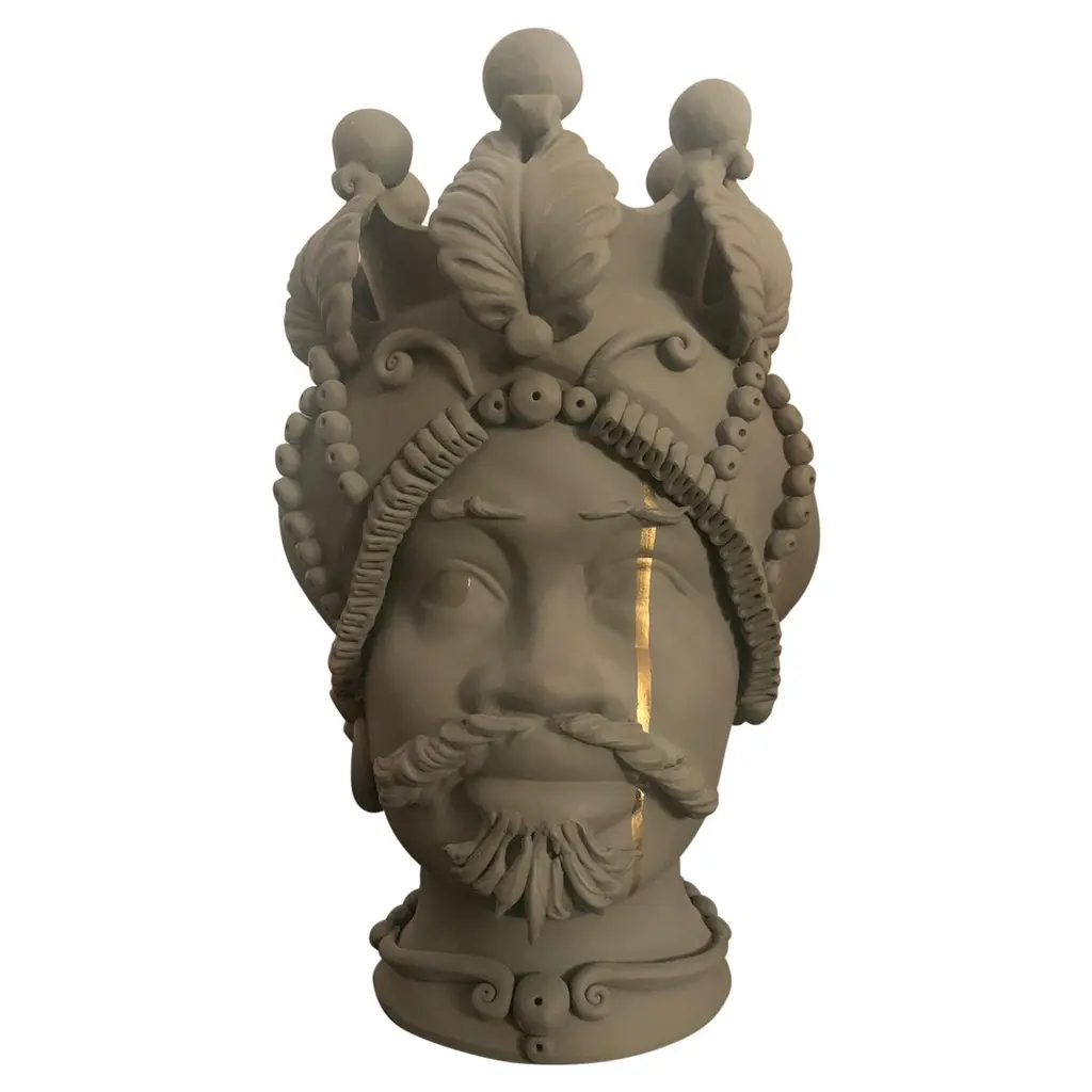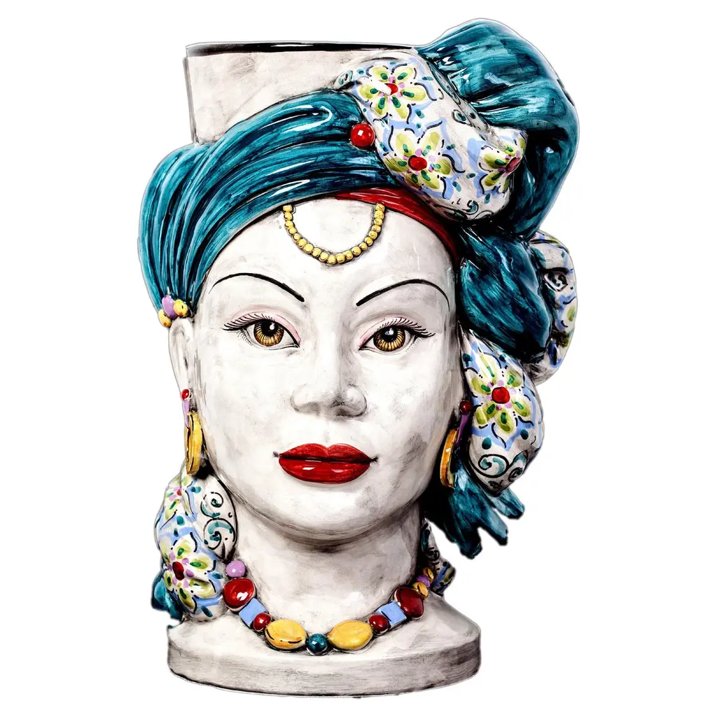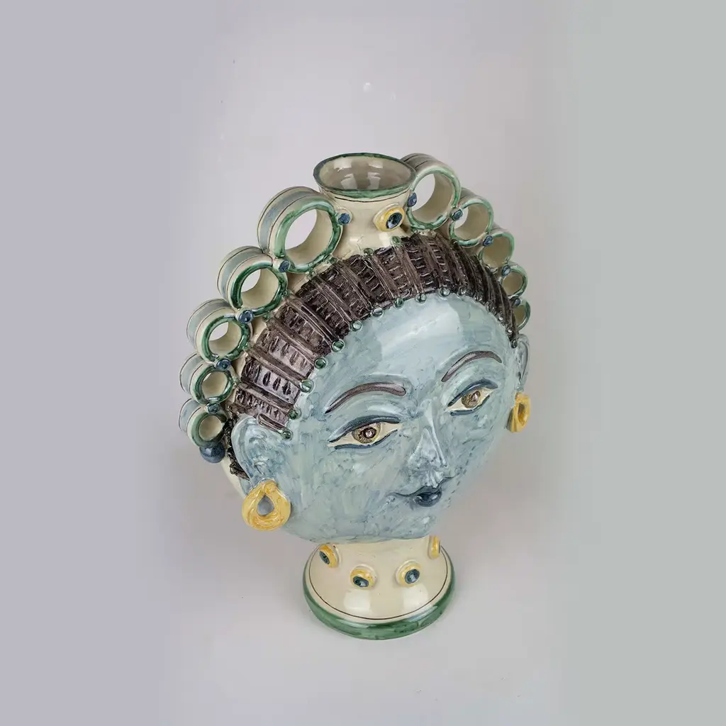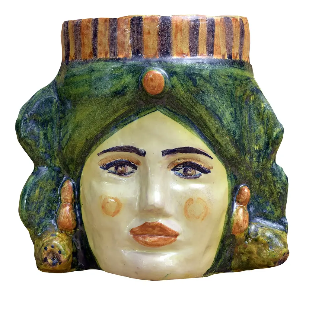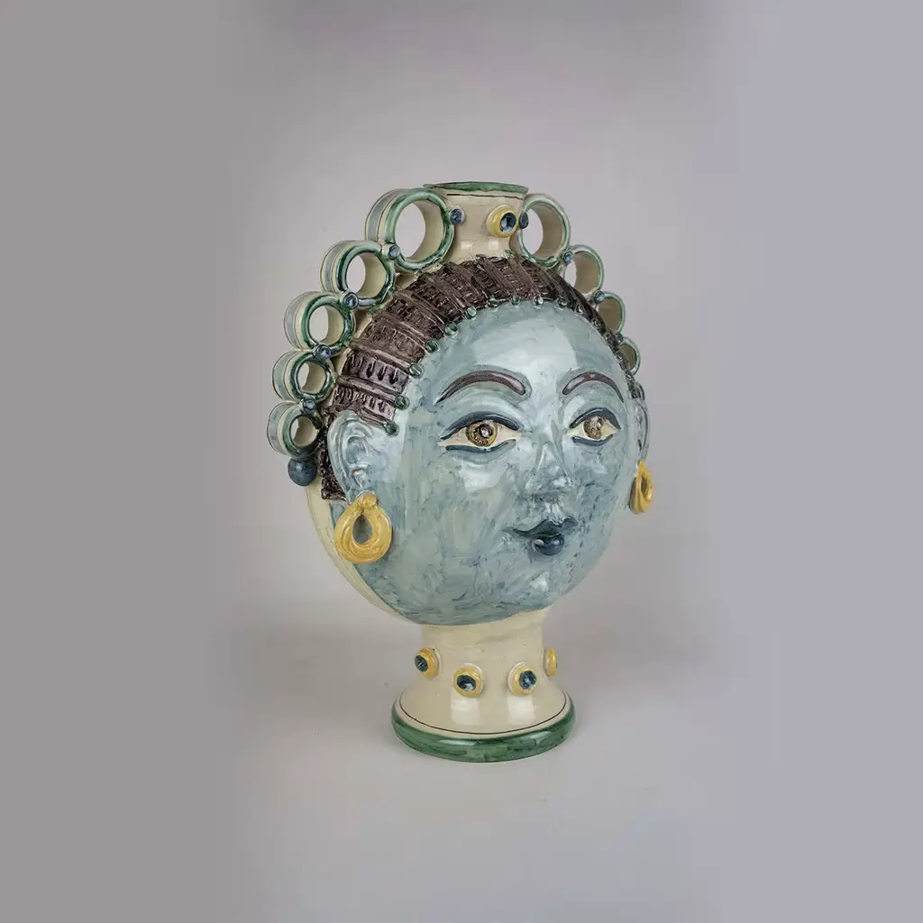 The face of the Goddess of the Mediterranean Sea portrayed in this fine ceramic vase stares out coyly. Entirely handmade and finely decorated, this lovely vase has a small opening at the top and is decorated in detail, from the gold earrings the woman wears, to the dainty bejeweled necklace around her neck, to her pursed lips. An elegant piece to be used or admired.