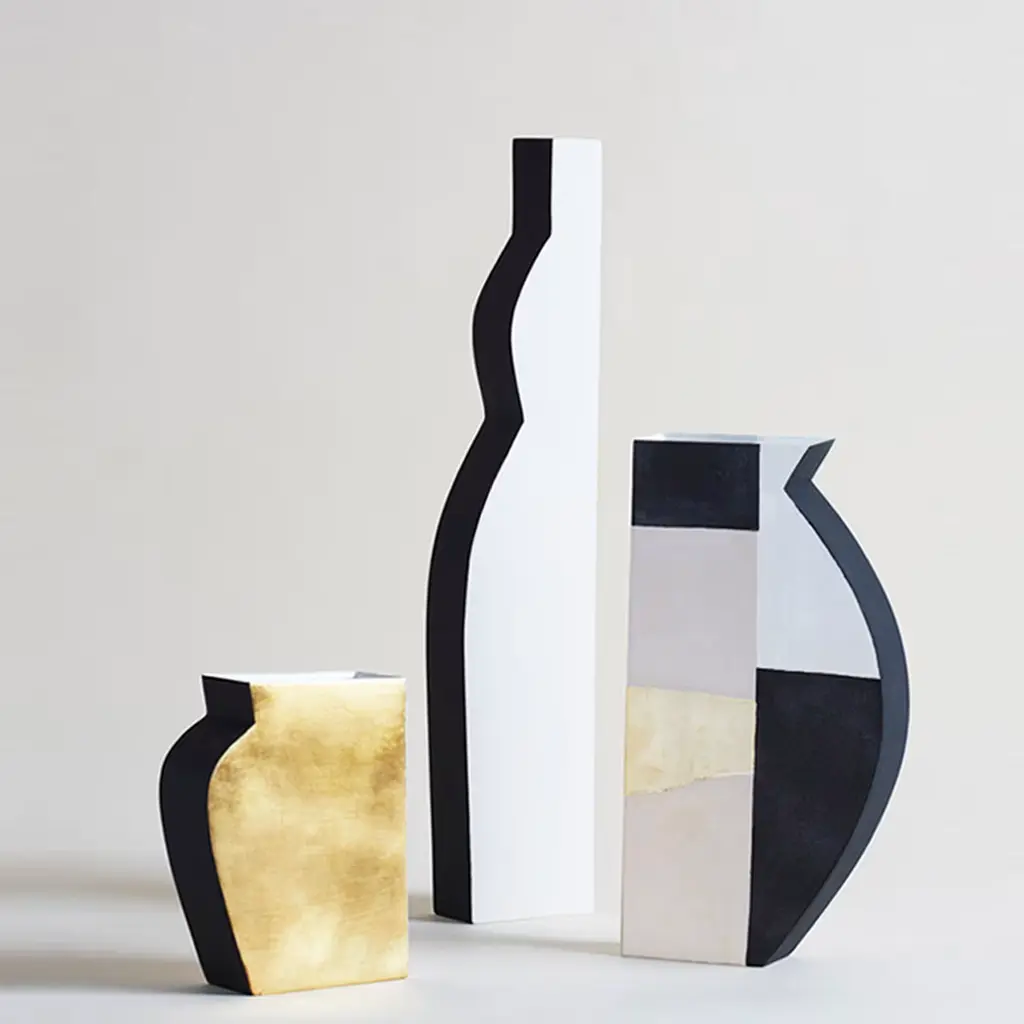 This exquisite vase is part of the Pacay series and features a narrow body, sinuous profile, and a color block decoration that, in this case, is enriched by the use of hand-applied gold leaf for front and back. The warm and elegant hue of the gold elegantly complements the white painted on the sides that gives this piece a contemporary character. Alone, or along with other vases from the same series, this piece adds a sophisticated light to any decor.