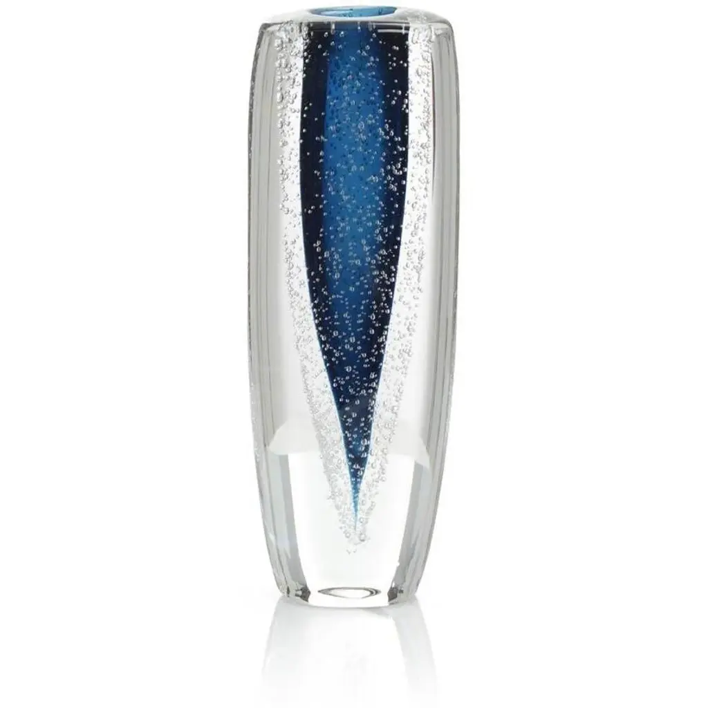 Hand blown by our master artisans, this piece showcases an alluring profile with gorgeous curves. The body of clear glass displays a beautiful shade of blue in the center, accented by flecks of gold to result in a stunning texture. The Gold Flecked Blue Handblown Glass Vase is also available in two alternate sizes, opening up opportunities for creative custom arrangements.