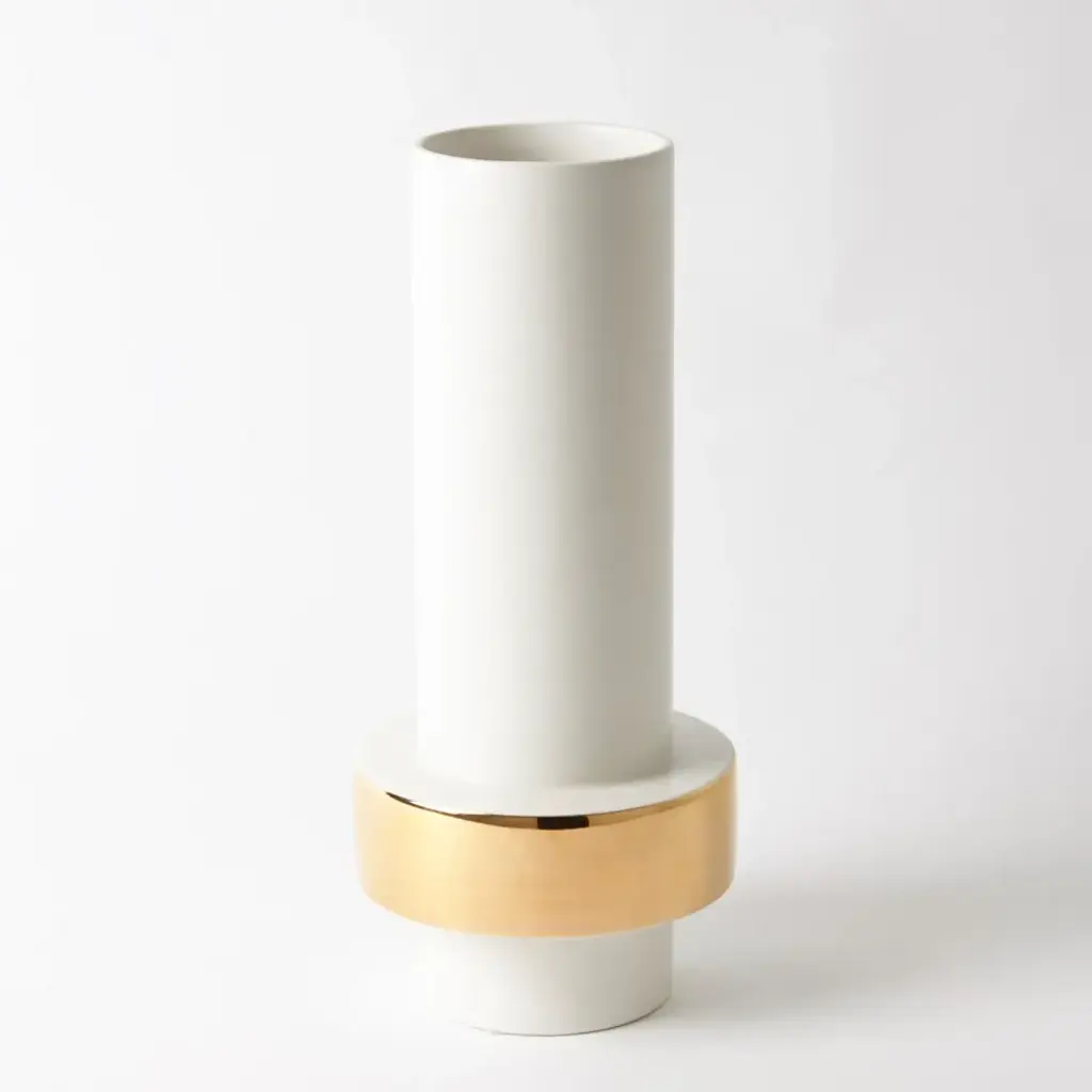 Simple meets luxe with our Gold Ring vases. Beautiful creamy white Portuguese ceramic cylindrical vases get a glam makeover with strategically placed metallic gold electroplated ring collars. Quite remarkable alone, but even better in a group! We have placed the "rings" at different levels so they may fit perfectly together, creating a stunning display. Available in three sizes. From a fashion forward perspective, Global Views offers accessories, furniture, statement lighting, and an assortment of rugs and mirrors to add beauty and joy to your home.