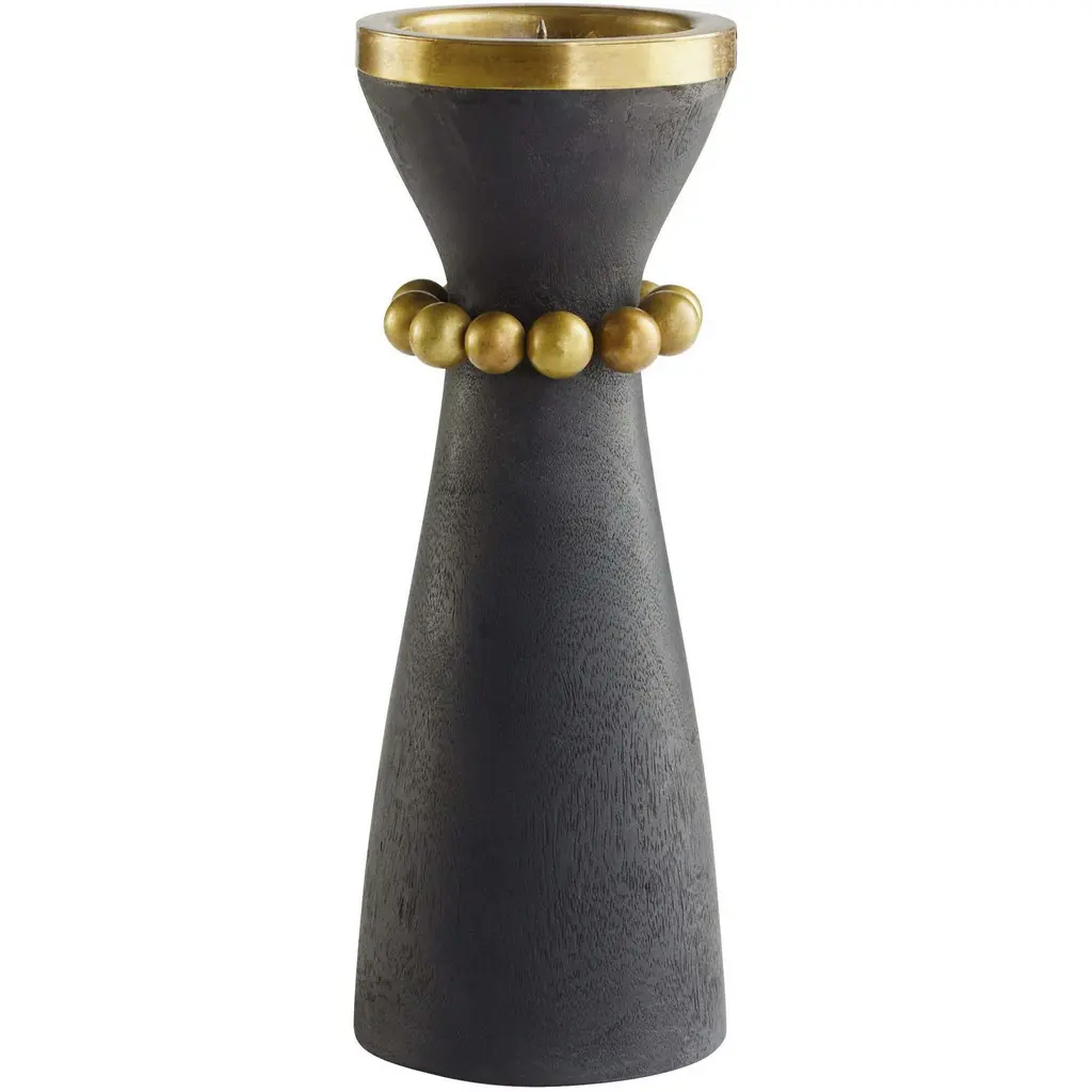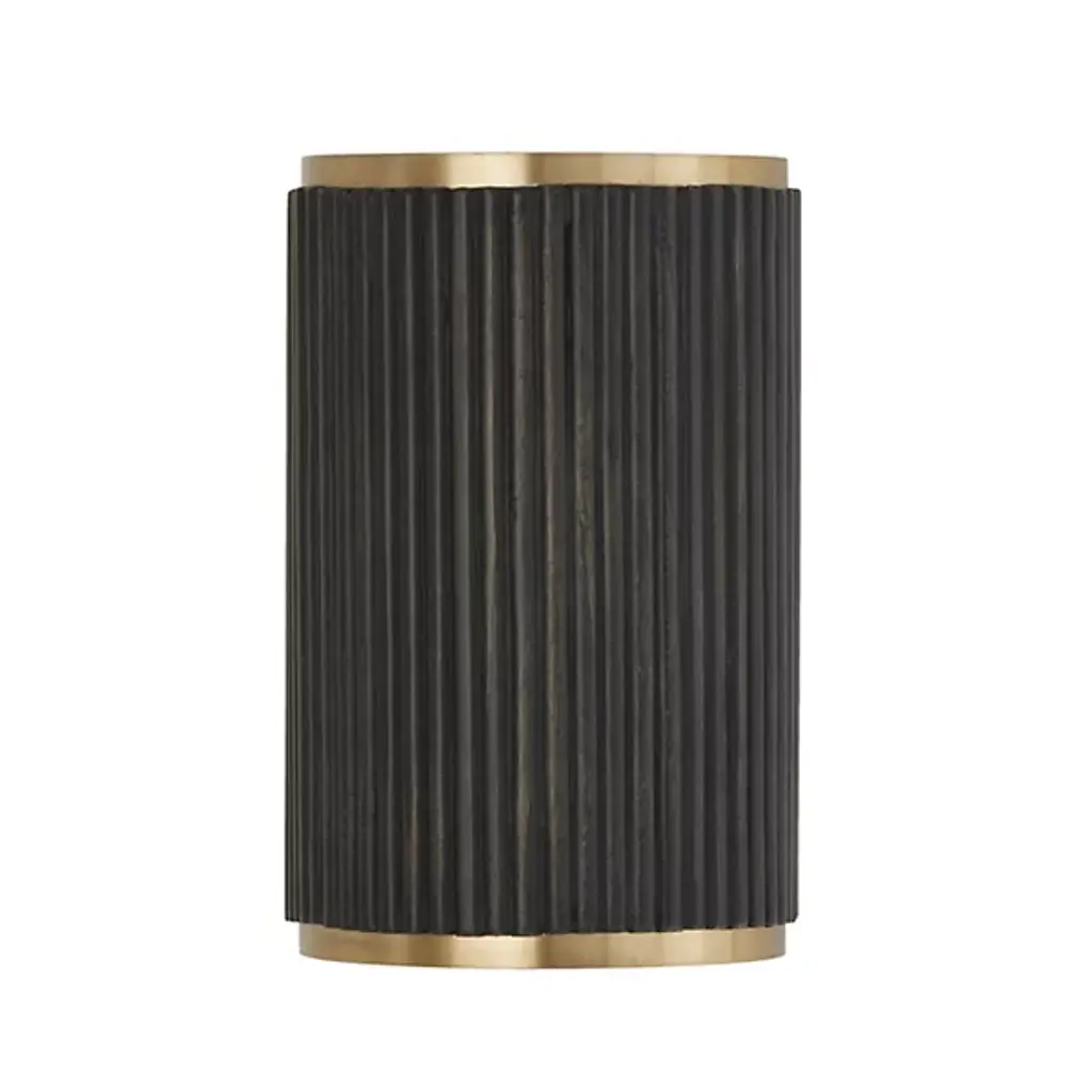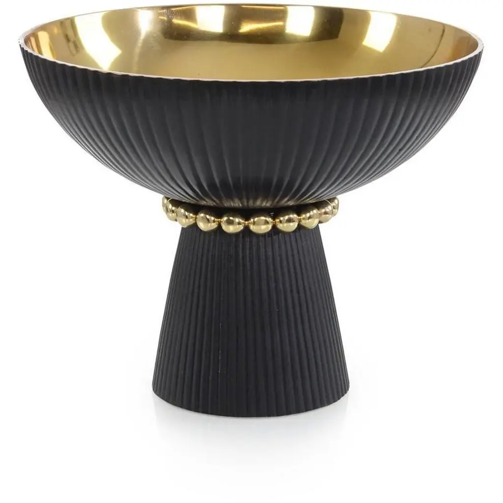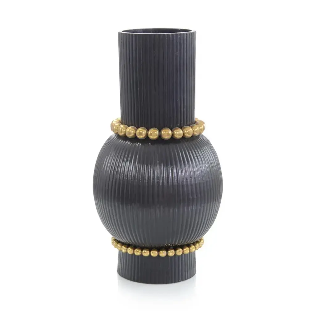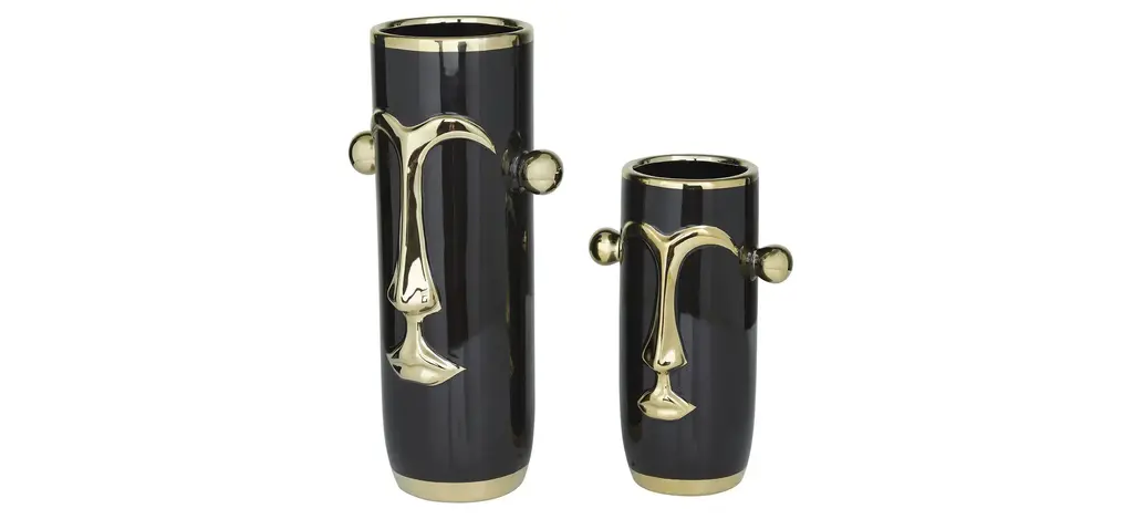 The Golden Disc Vases are chic decorative accents with a sophisticated look. Both ceramic bowls display a stylish shade of black with vertical striations covering the exterior for a textural look, Both vases feature an artistic display of small Gold Leaf discs that line the rim.