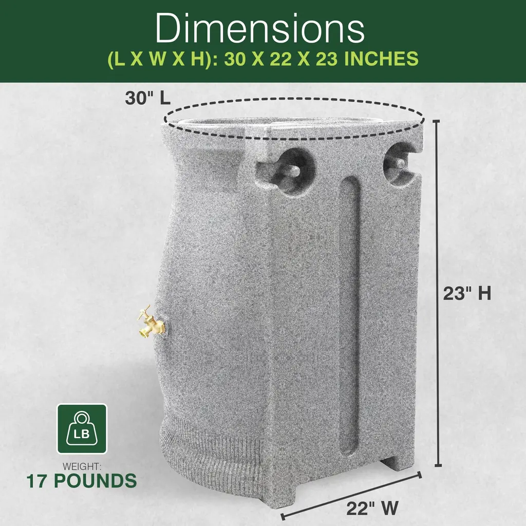 When drought sets in and rain is in short supply, rain barrels can provide that precious water you need for your lawn and garden. The Good Ideas Rain Wizard 50 Gallon Plastic Rain Barrel Urn is a thing of beauty and is cleverly designed. Constructed with thick and durable plastic which holds up to the harshest elements, the exterior has the appearance of a sculpted urn. The graceful lines, curves, and garnishes on the exterior make it an excellent accent piece to the outside of your home. Built with a flat-back design, these rain barrel urns optimize the space used and allow you to position the barrel close to walls or flat areas. The top acts not only as a planter space but as a unique watering system that leeches excess water from the barrel itself. There's also a channel built into the rim that diverts overflowing water to the front and away from the foundation. Two brass spigots allow you to attach a hose at the front or use the side spigot to fill tall buckets. You can have peace of mind knowing that you're helping the environment by conserving water and giving your garden the best water it can get, devoid of harsh chemicals and rich in nutrients. Keep your yard and garden watered naturally using the Good Ideas Rain Wizard 50 Gallon Plastic Rain Barrel Urn. This sustainable approach not only conserves resources but also promotes a greener and more environmentally conscious gardening practice. Set of (3) 50-gallon rain barrel urns by Good Ideas that add style and beauty to your outdoor space while helping the environment by conserving water Carefully engineered to withstand the rigors of the most challenging environmental conditions, including harsh weather and other elements Constructed with a flat-back design that serves as a space-optimizing feature, enabling you to conveniently place the barrel near walls or flat surfaces, thus maximizing spatial efficiency Top acts as a planter space and features a unique watering system that leeches excess water from the barrel itself Two brass spigots allow you to attach a hose at the front or use the side spigot to fill tall buckets; Second spigot can be used as an additional overflow control or link to other barrels Channel built into the rim diverts overflowing water to the front and away from the barrel and home foundation Material: Plastic Color: Light Granite Dimensions (L x W x H): 30 x 22 x 23 inches Weight: 17 pounds Manufacturer warranty: 1-year warranty Quantity: 3