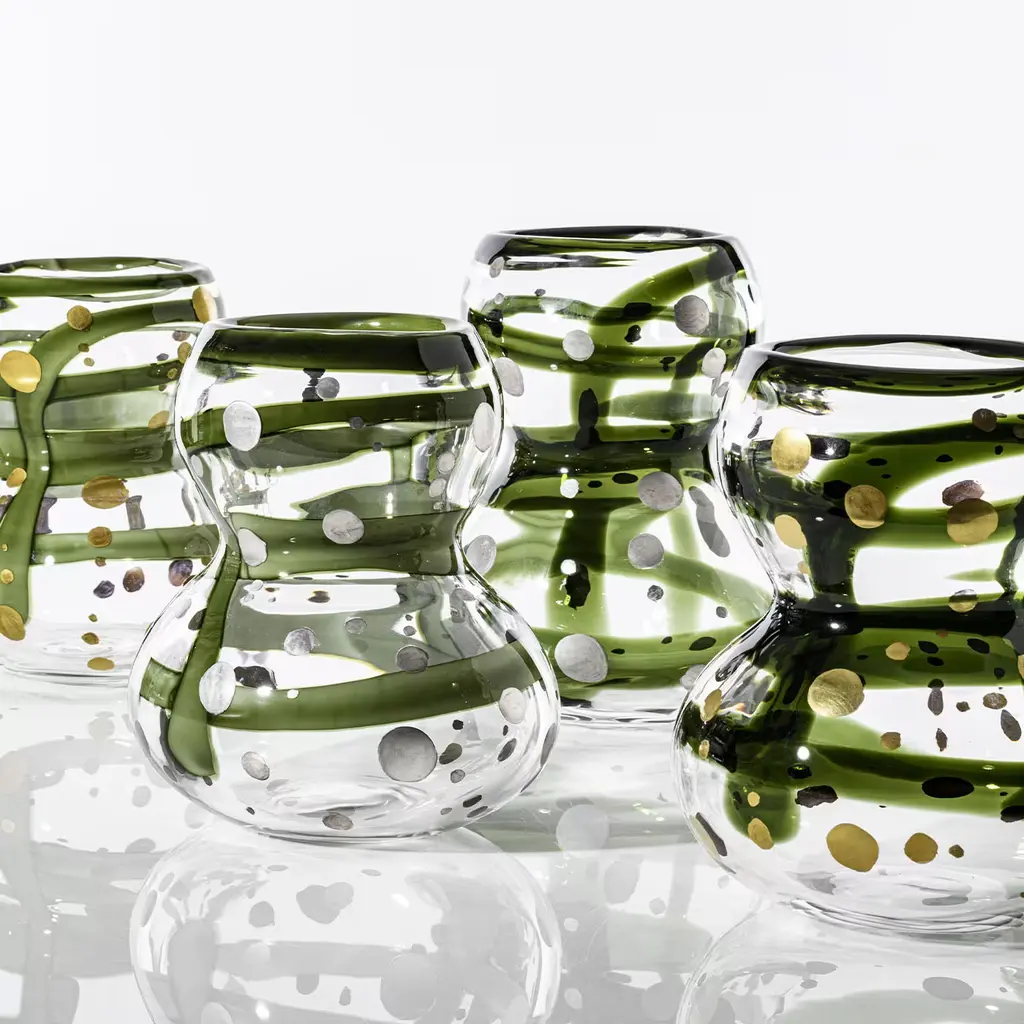 The sculptural vase, Gran Bulbo Mini by Peter Marino, embodies the skill of master glassmakers and centuries-old craftsmanship. Handcrafted using the blown glass technique, it showcases a crystalline hue complemented by green glass bands. Enhanced with silver enameled finishes, this masterpiece harmonizes artisanal tradition with exquisite artistry.